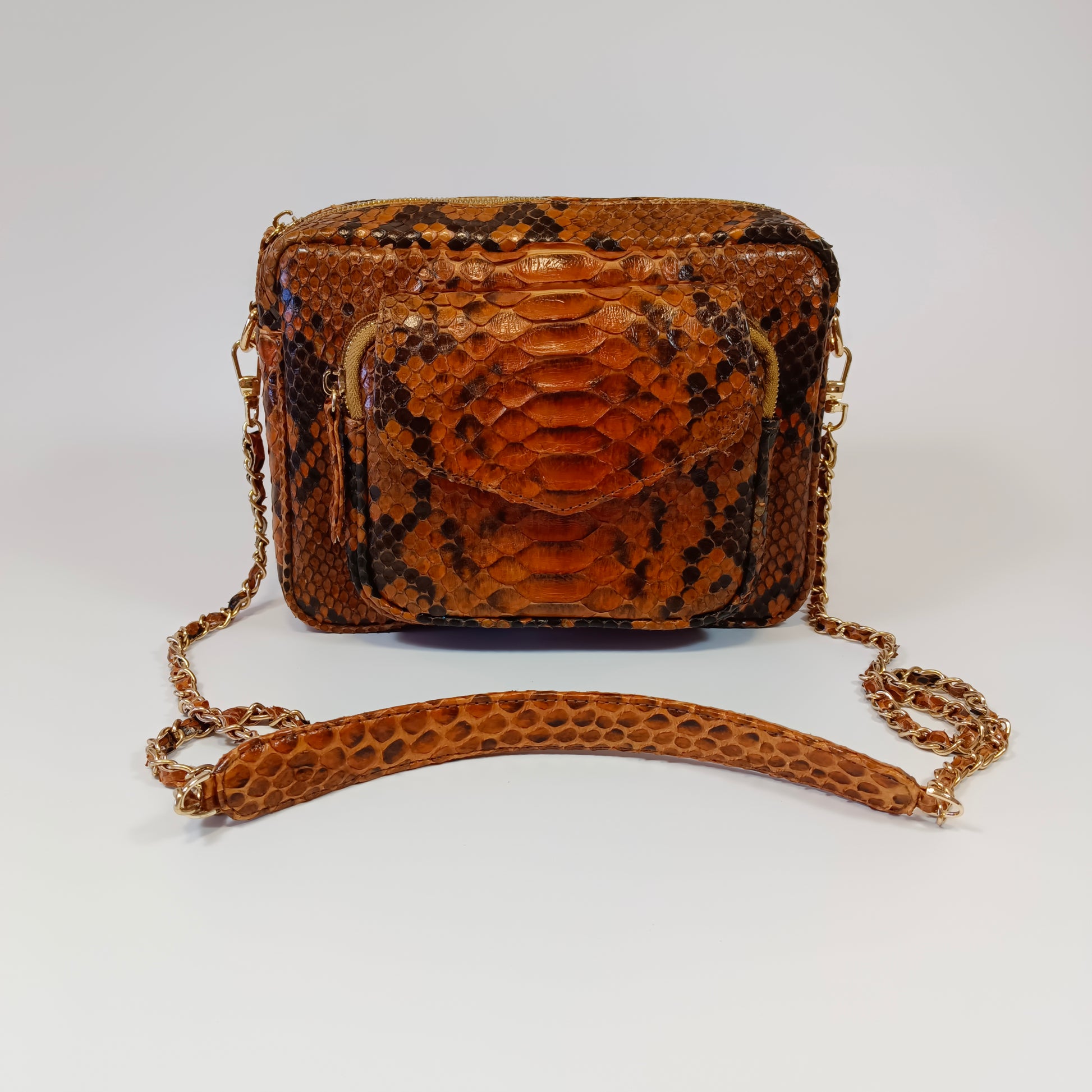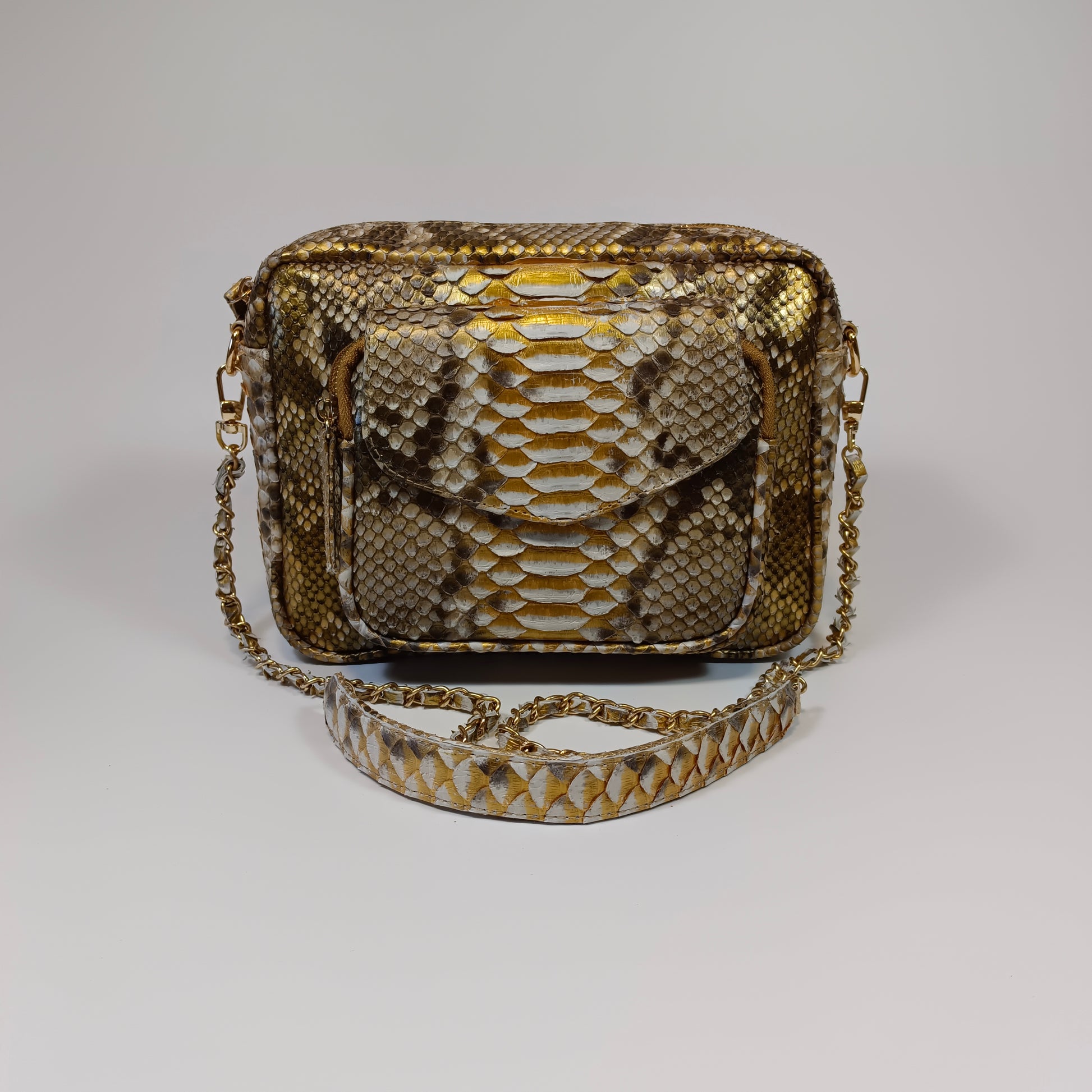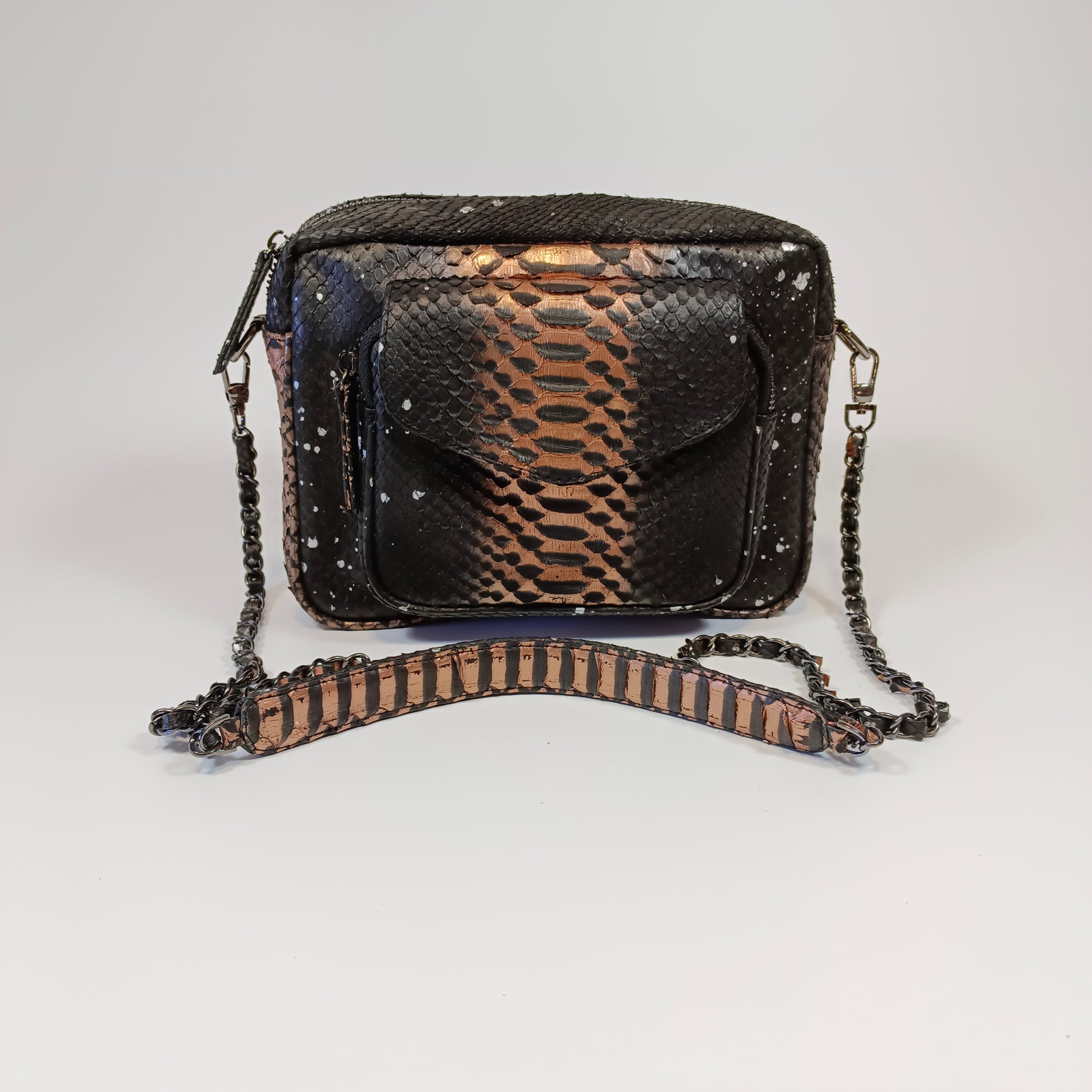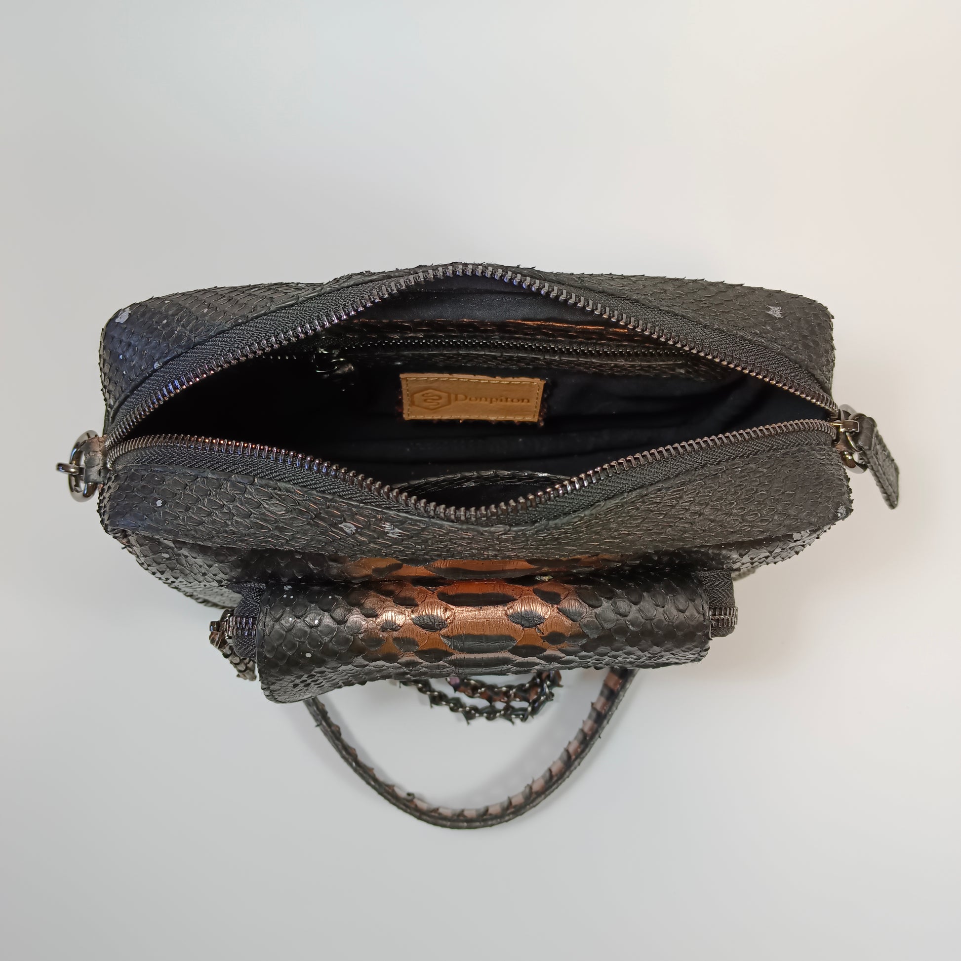 A bolsa Chark é confeccionada à mão com pele de cobra Python genuína do Sudeste Asiático, proporcionando uma exclusividade inigualável. Cada peça é única, com padrões e tonalidades próprios que refletem a singularidade da pele, comparável à biometria humana. Com um design que equilibra sofisticação e modernidade, a Chark é ideal para quem valoriza luxo e autenticidade, oferecendo um estilo exclusivo e inconfundível. Dimensões: 22 cm de comprimento, 7 cm de largura e 16 cm de altura | alça em couro e corrente de metal 120 cm.