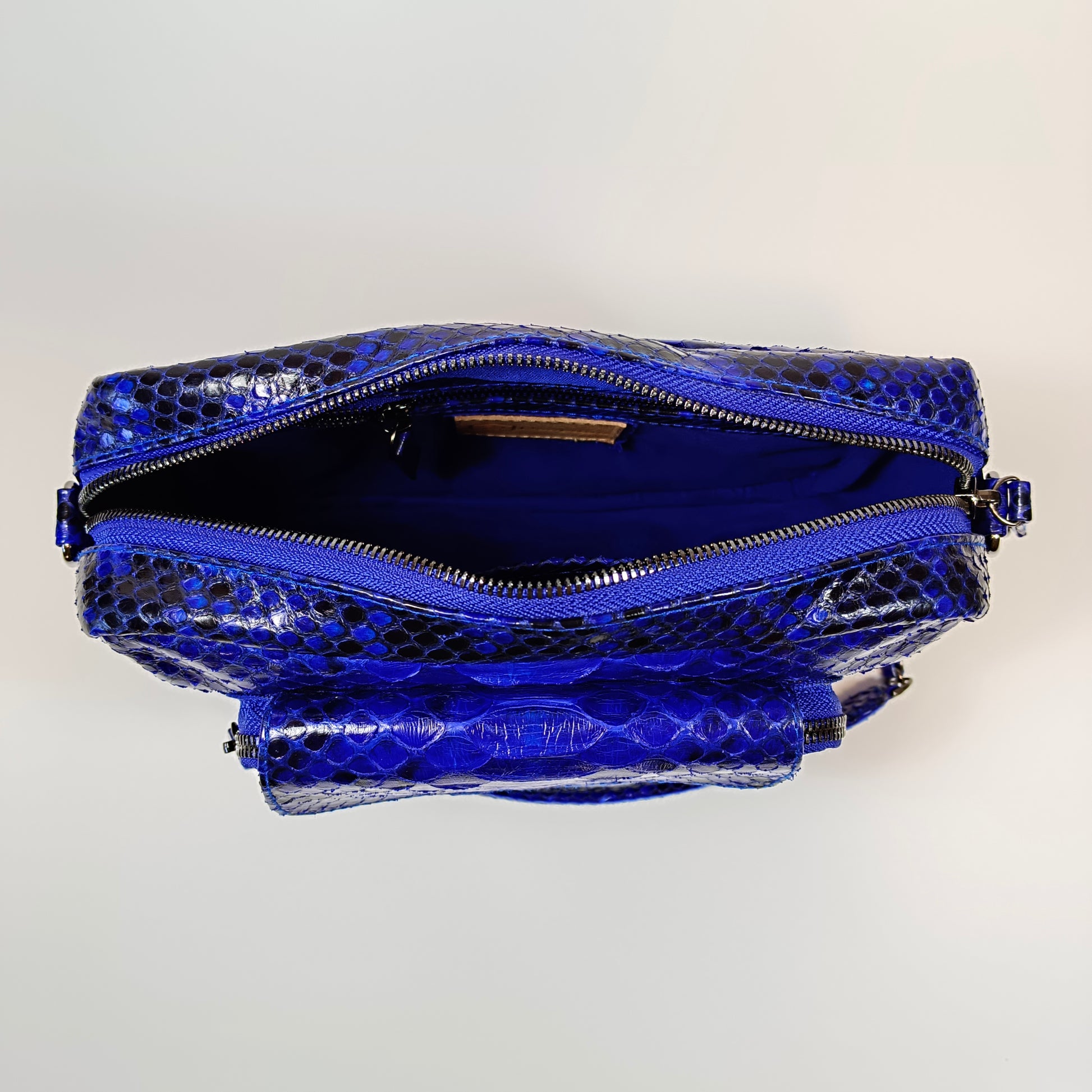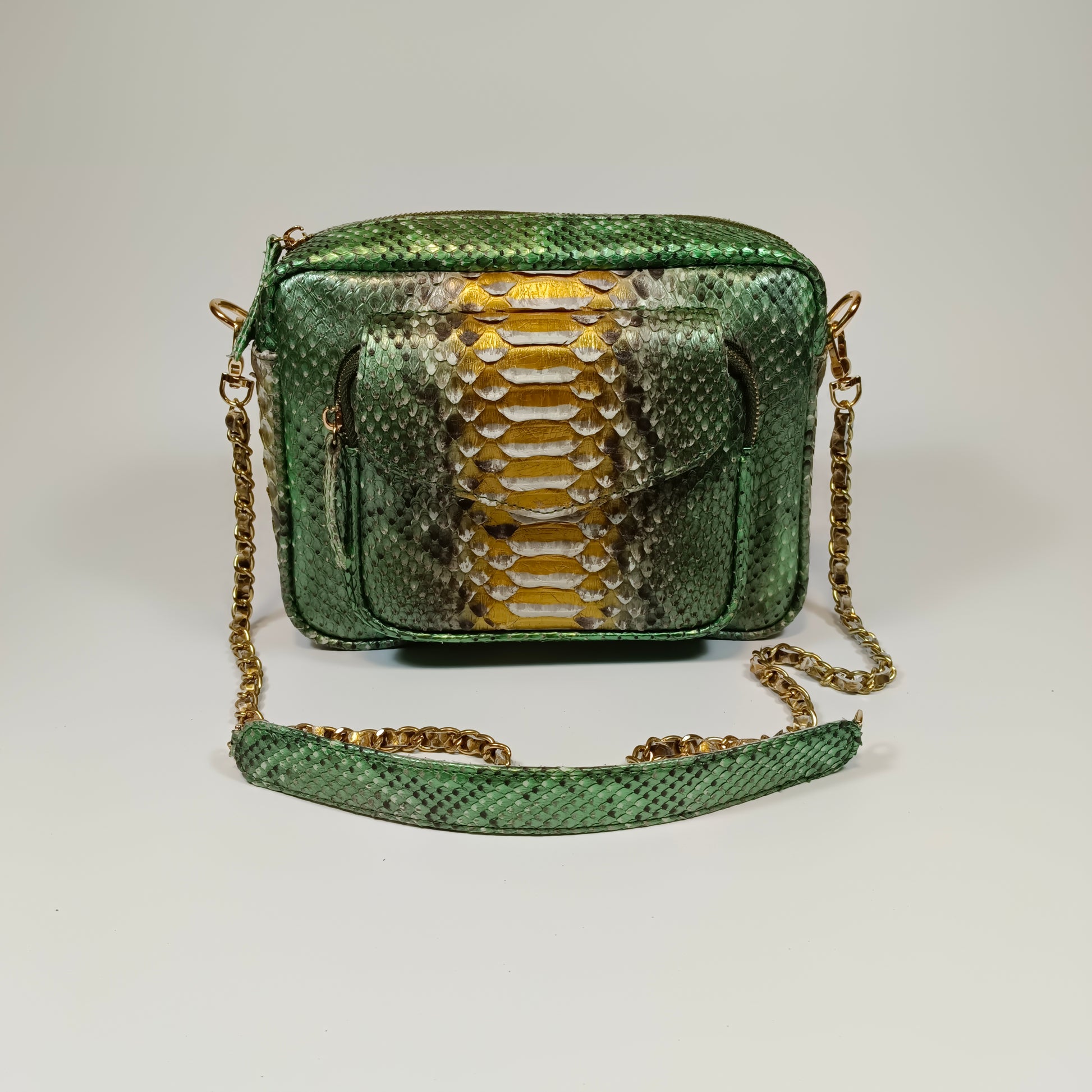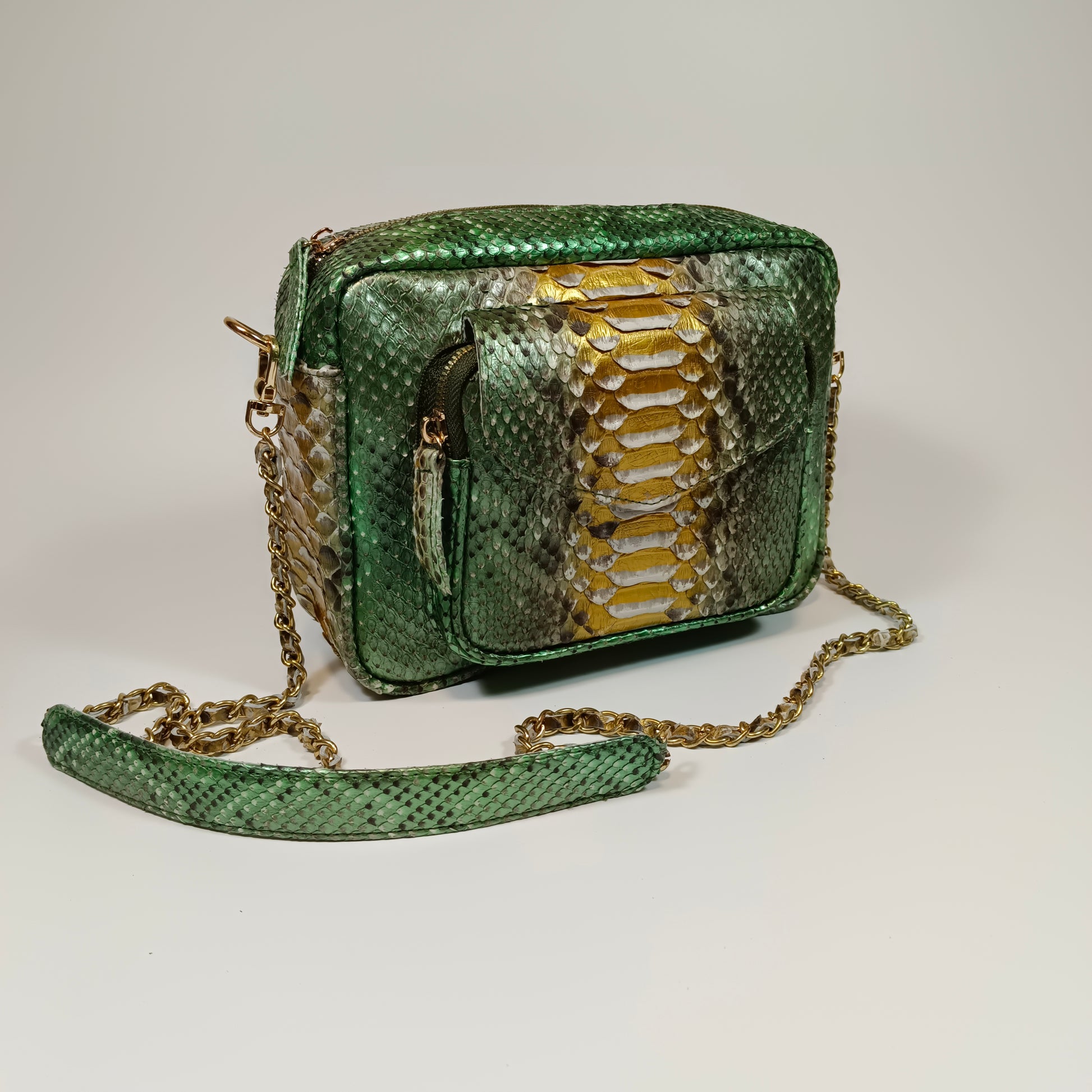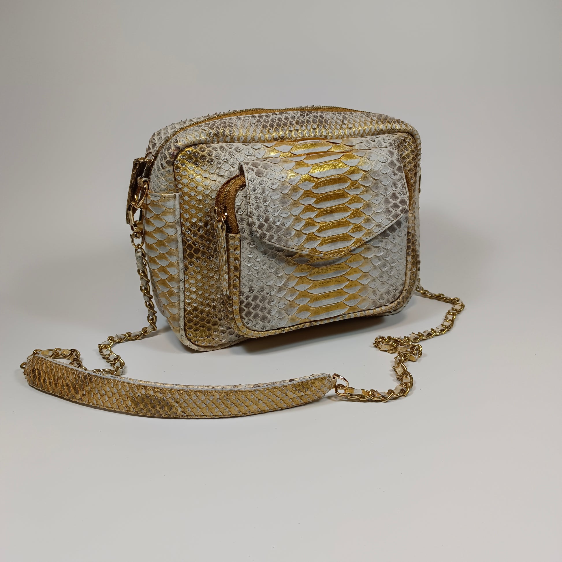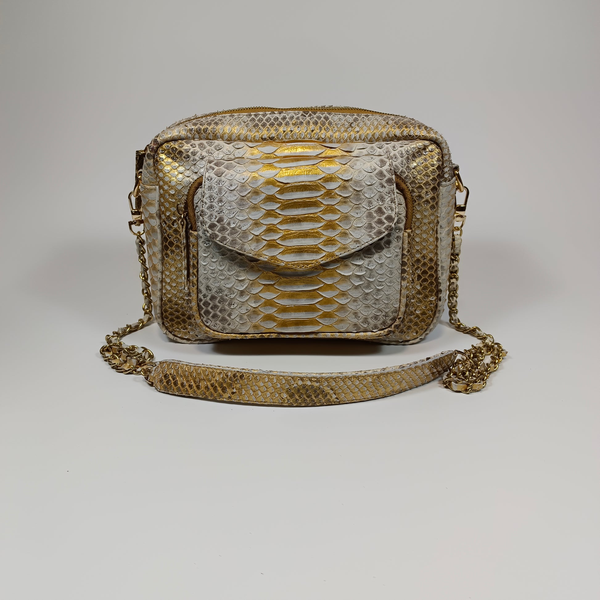 A bolsa Chark é confeccionada à mão com pele de cobra Python genuína do Sudeste Asiático, proporcionando uma exclusividade inigualável. Cada peça é única, com padrões e tonalidades próprios que refletem a singularidade da pele, comparável à biometria humana. Com um design que equilibra sofisticação e modernidade, a Chark é ideal para quem valoriza luxo e autenticidade, oferecendo um estilo exclusivo e inconfundível. Dimensões: 22 cm de comprimento, 7 cm de largura e 16 cm de altura | alça em couro e corrente de metal 120 cm.