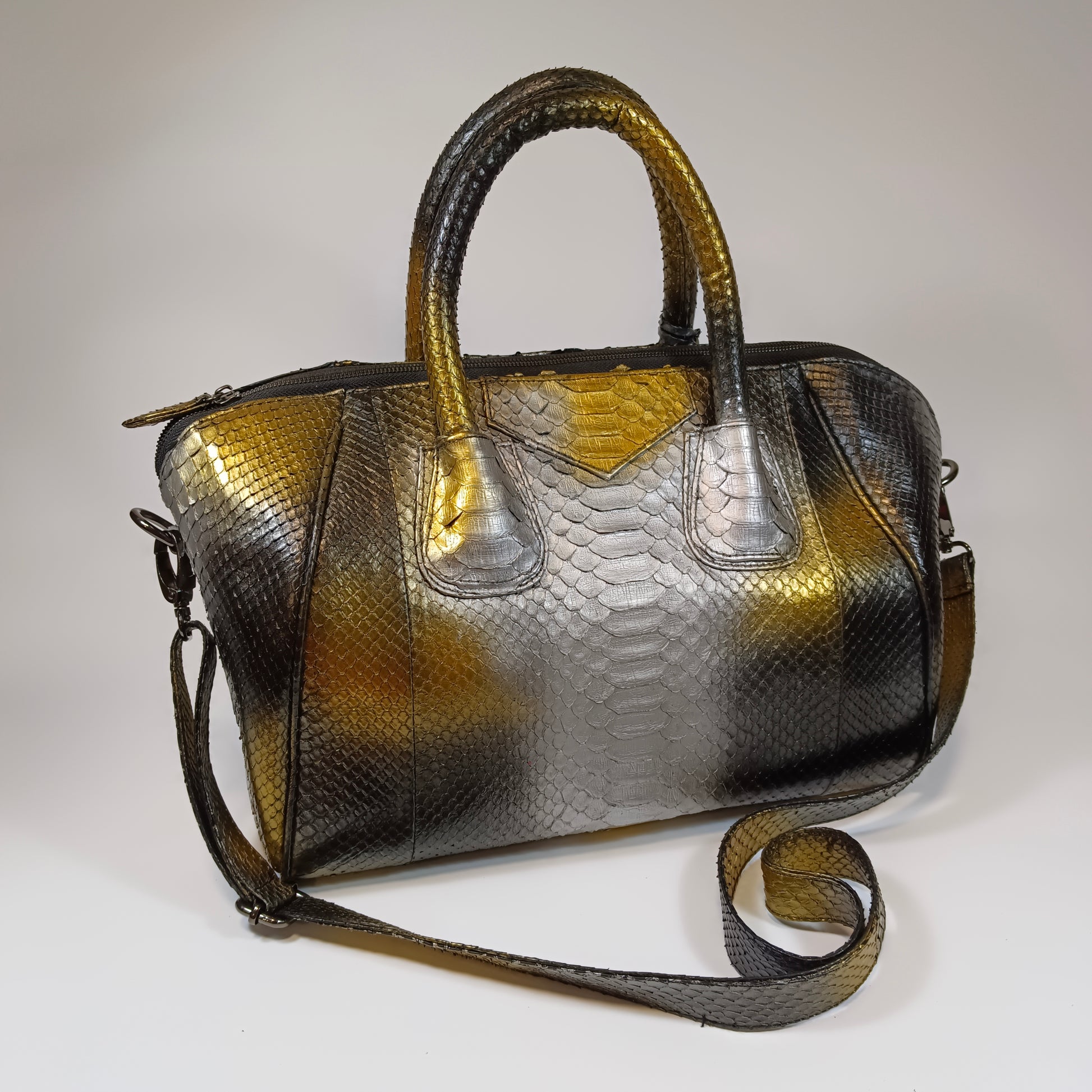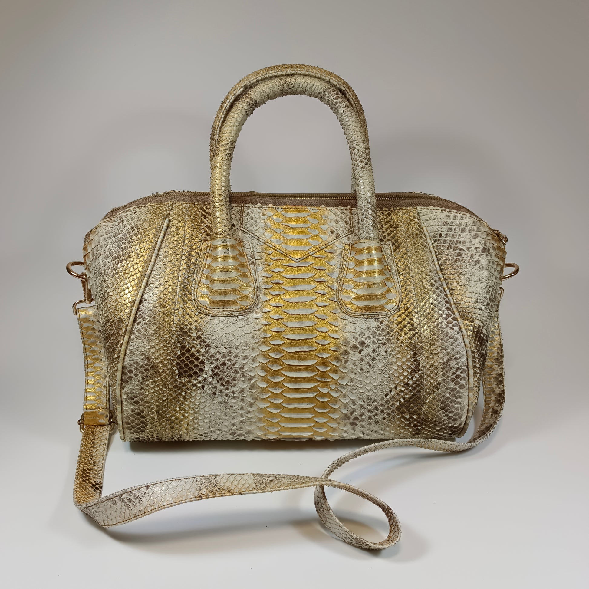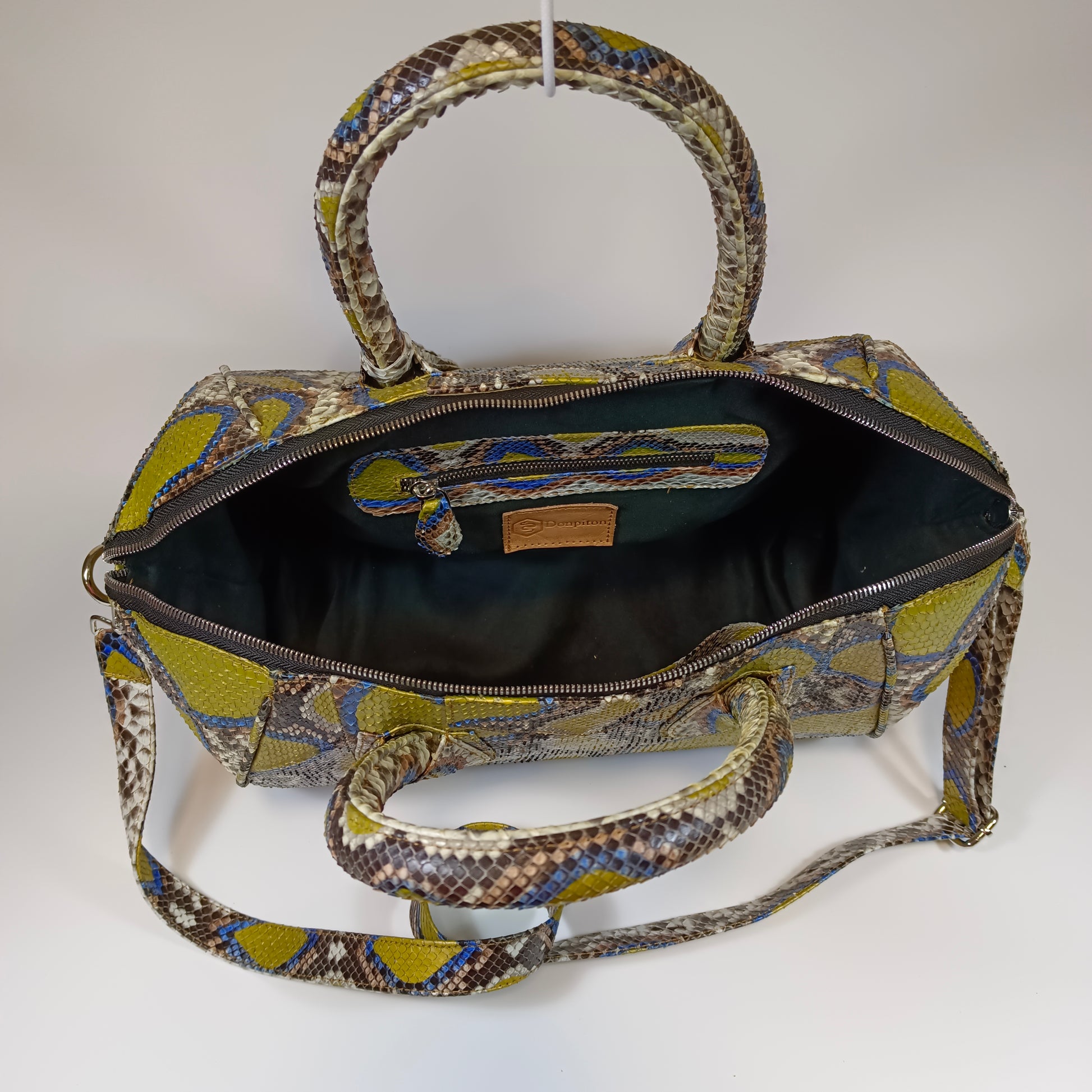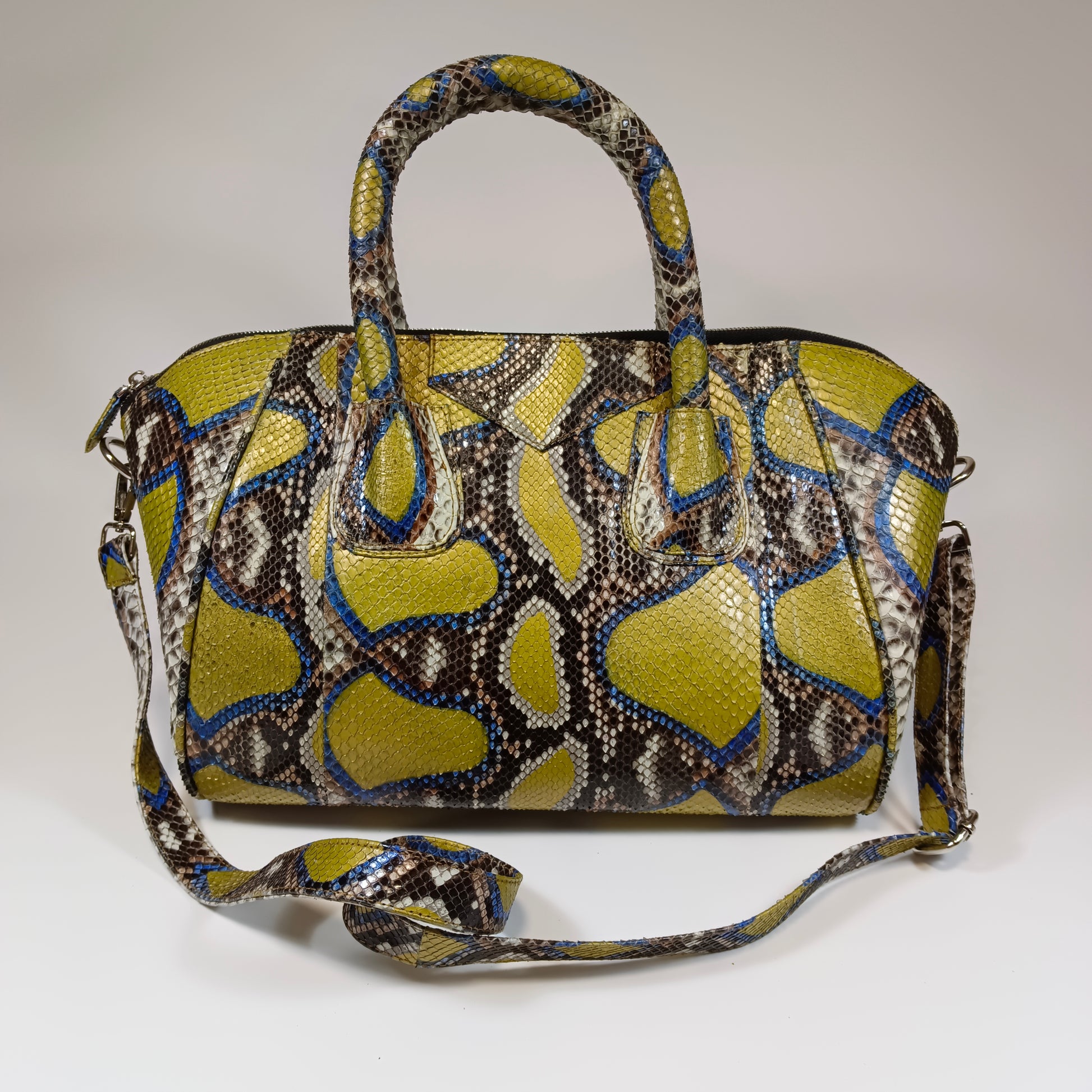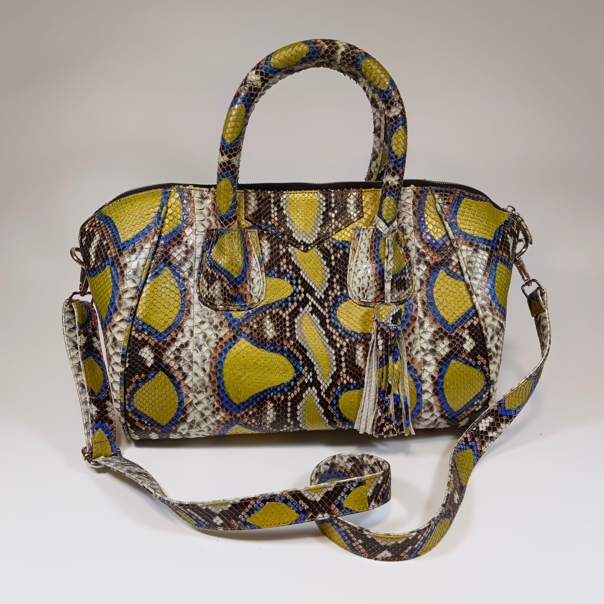 A bolsa Galia, confeccionada à mão com pele de cobra Python genuína do Sudeste Asiático, traz exclusividade em cada peça com padrões e tonalidades únicos. Seu design refinado e artesanal combina luxo e autenticidade, tornando-a perfeita para quem busca um acessório que une elegância e personalidade. Dimensões: 35 cm de comprimento, 20 cm de largura e 26 cm de altura | alça de couro 115 cm.