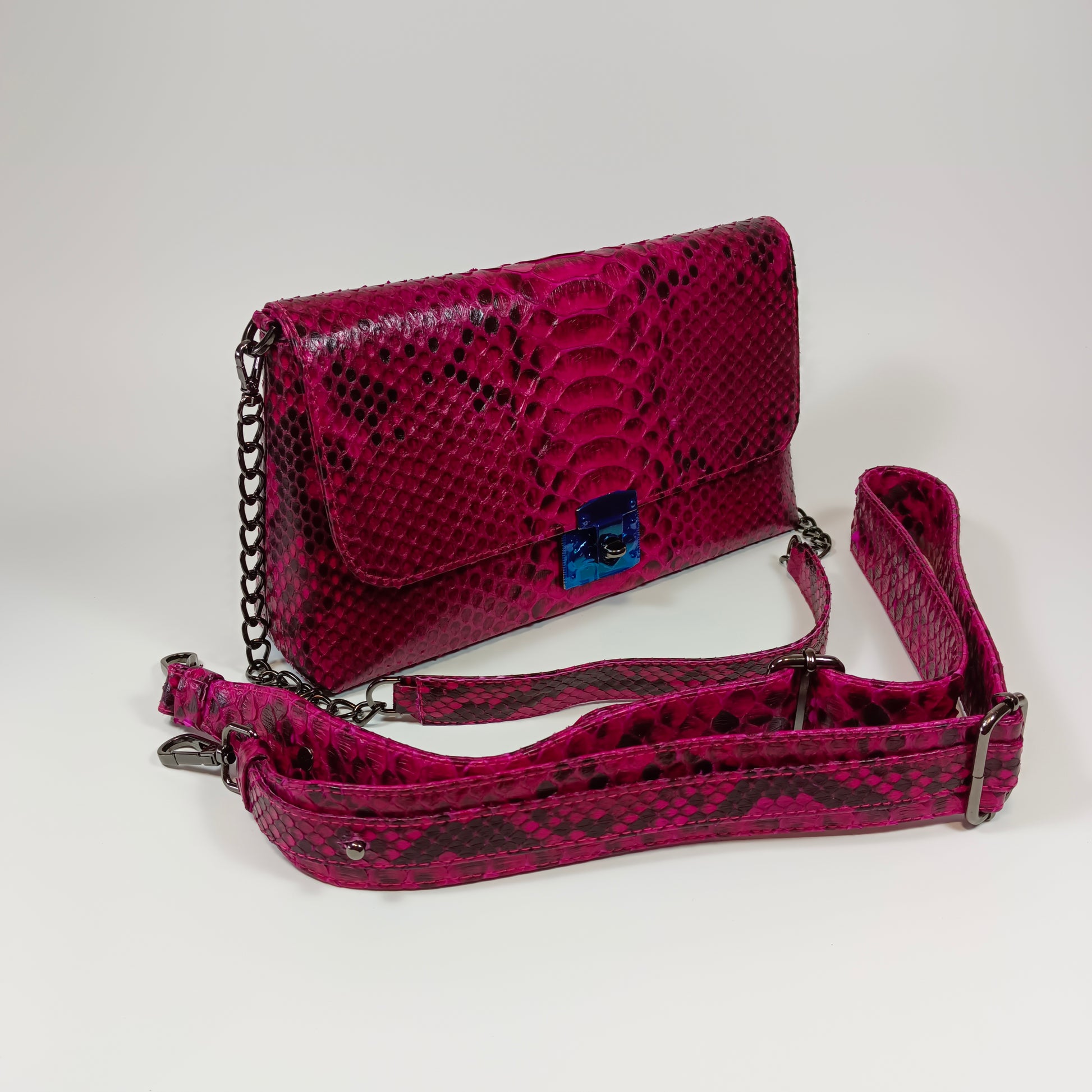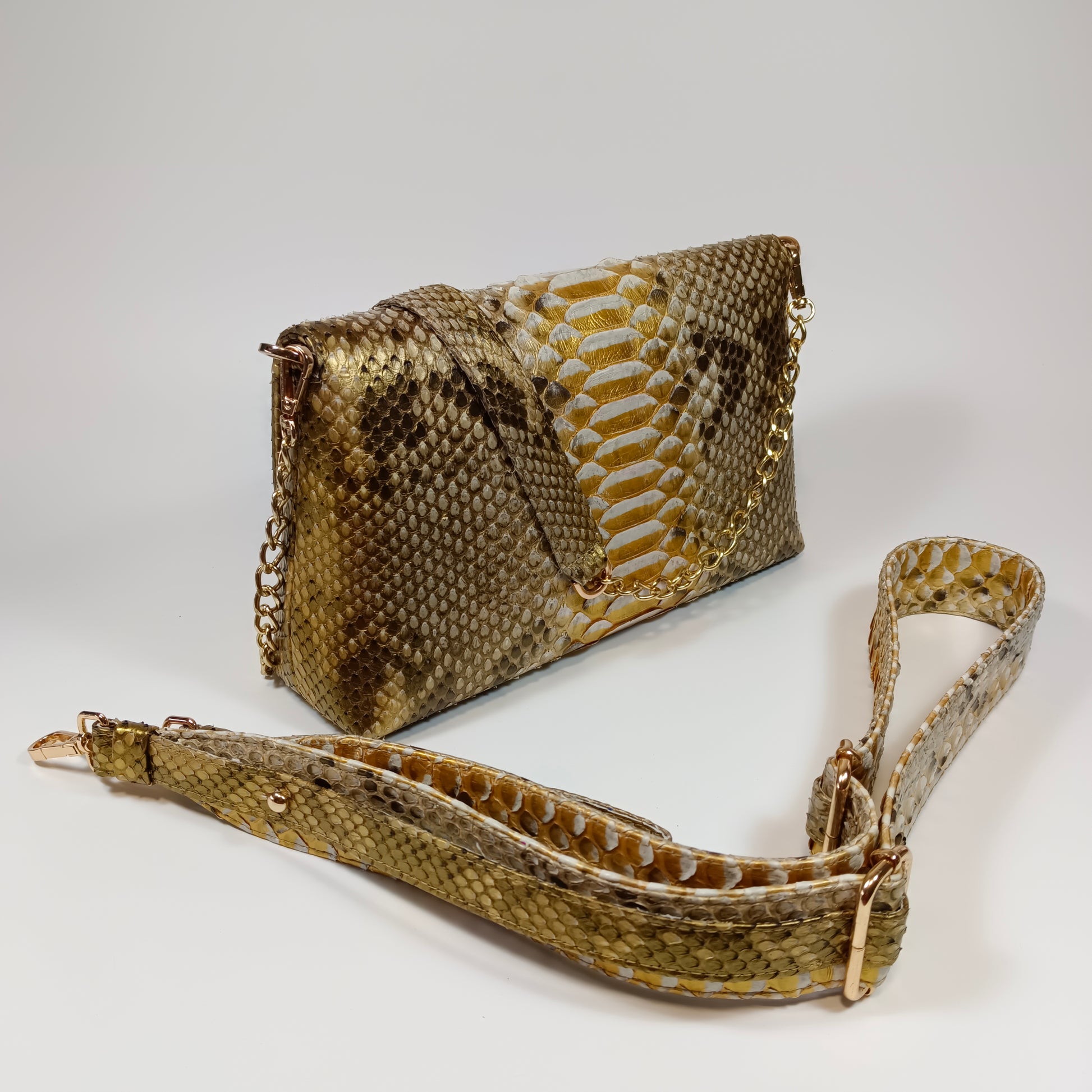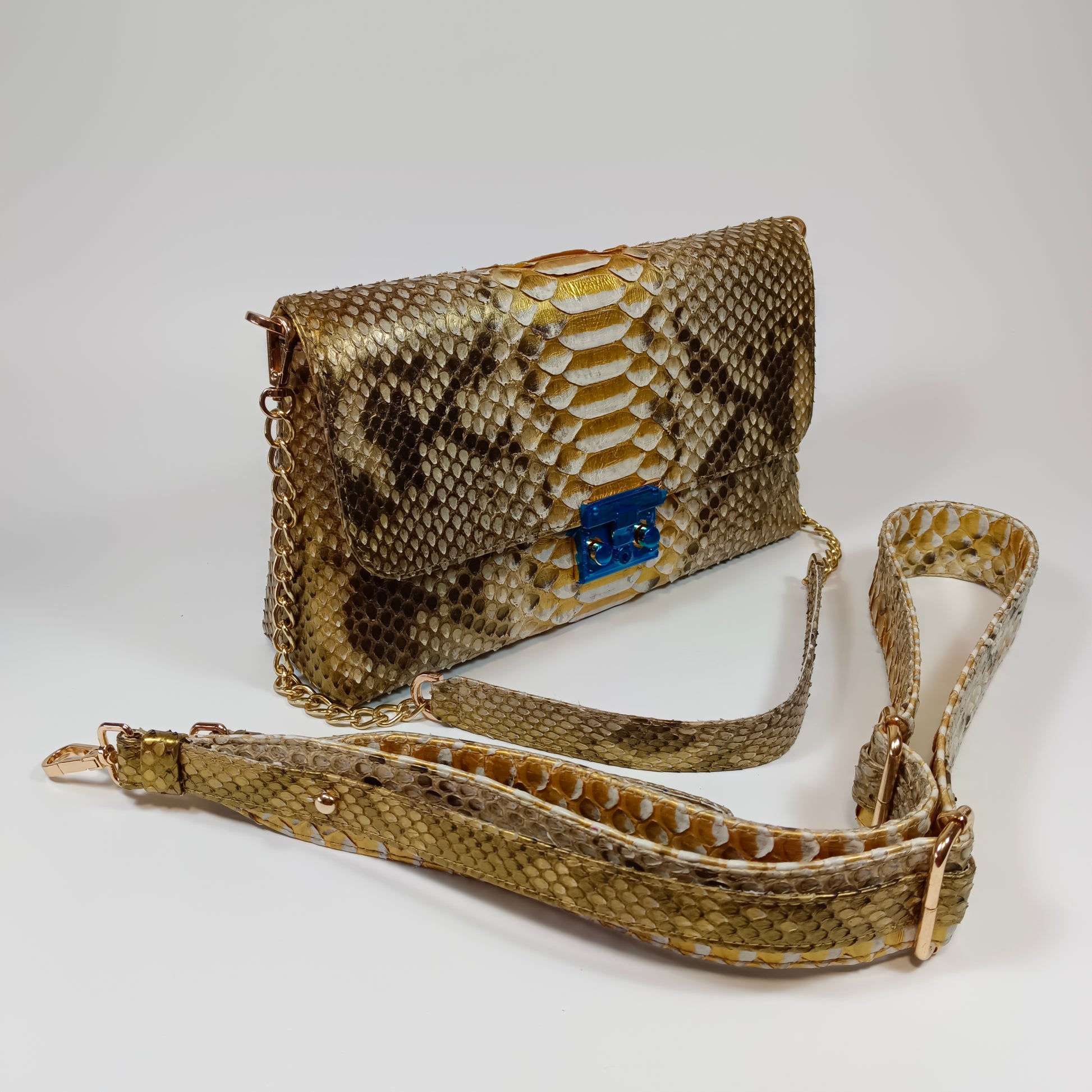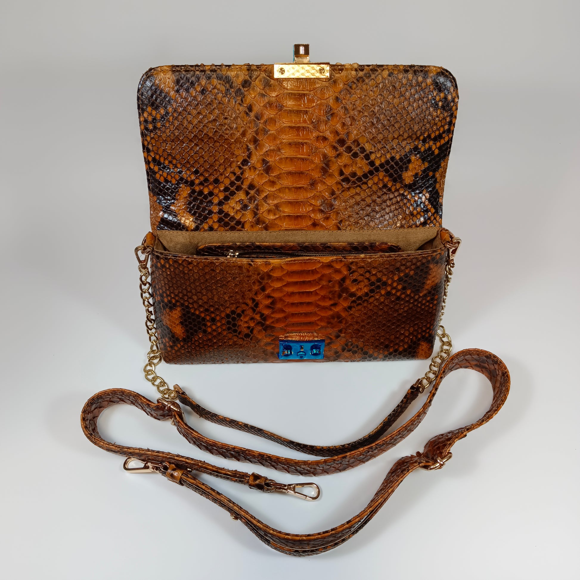 A Bolsa Gun, confeccionada em pele de cobra Python genuína, oferece luxo e exclusividade em cada detalhe. Seu design atemporal combina sofisticação com resistência, ideal para quem busca estilo e durabilidade. Feita à mão, cada peça é única, refletindo elegância e autenticidade. Uma escolha premium que destaca sua personalidade e bom gosto. Dimensões: 28 cm de comprimento, 8 cm de largura e 16 cm de altura | alça em couro e corrente de metal 70 cm e alça de couro 115cm.