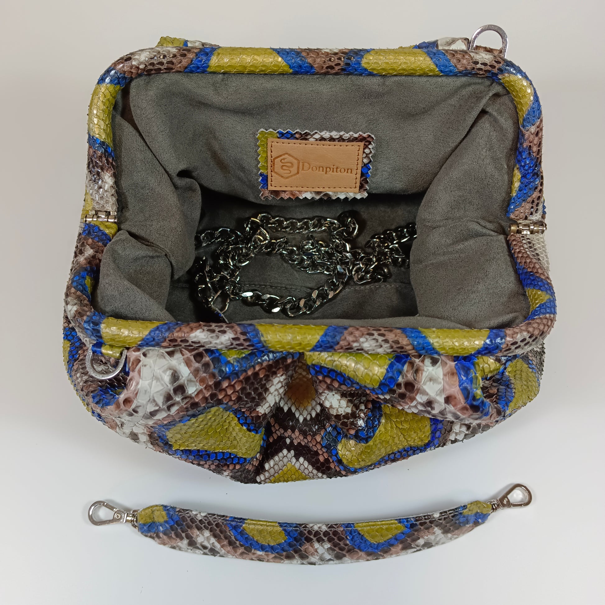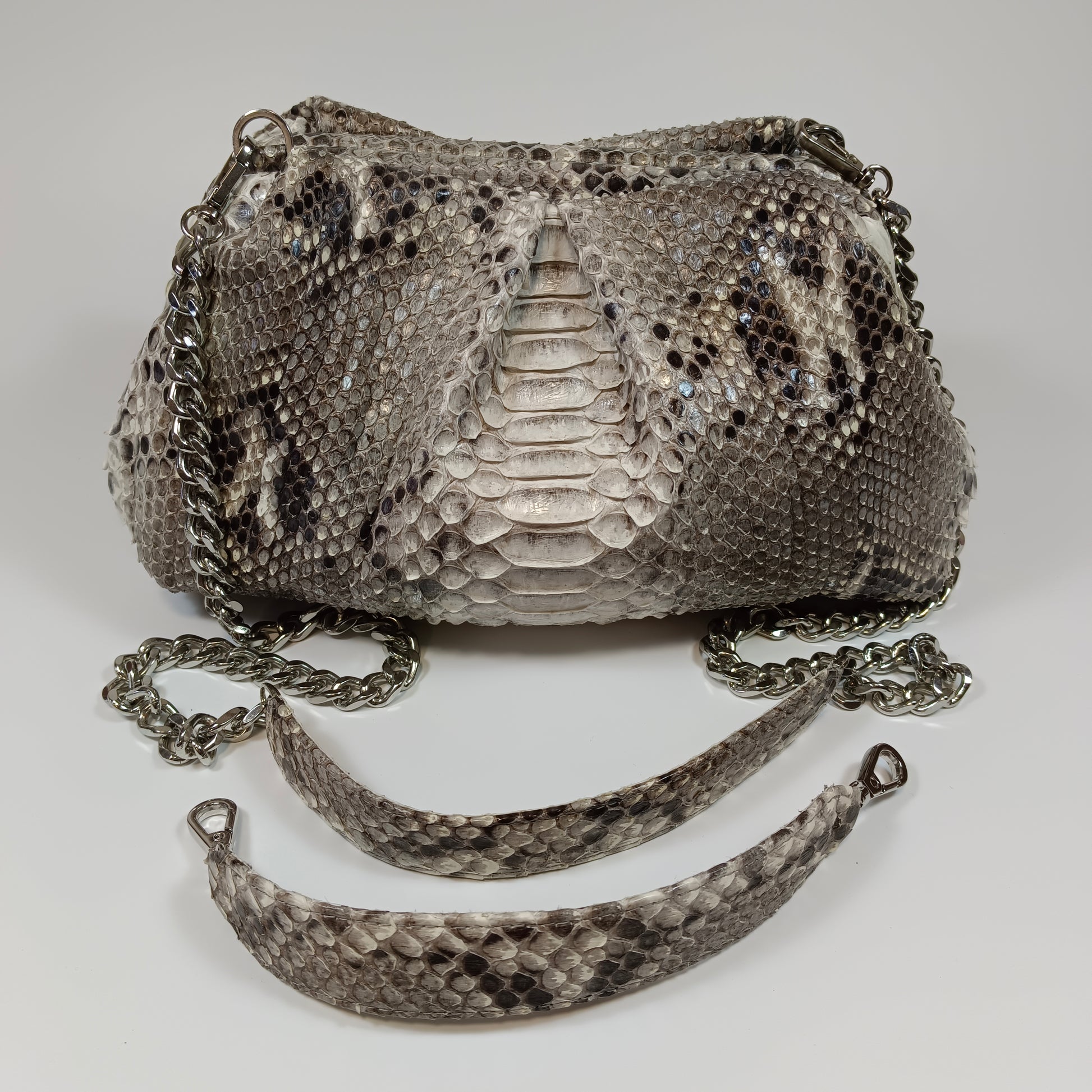 A bolsa Ladoga é cuidadosamente confeccionada à mão com pele de cobra Python genuína, proveniente do Sudeste Asiático, trazendo uma exclusividade única em cada peça. Assim como a natureza de cada Python, suas escamas apresentam padrões e cores distintas, tornando cada bolsa incomparável. Com um design que combina elegância e modernidade, a Ladoga é o acessório perfeito para quem deseja expressar luxo e autenticidade em um estilo marcante e exclusivo. Dimensões: 30 cm de comprimento, 11 cm de largura e 16 cm de altura | alça de corrente de metal 116 cm.
