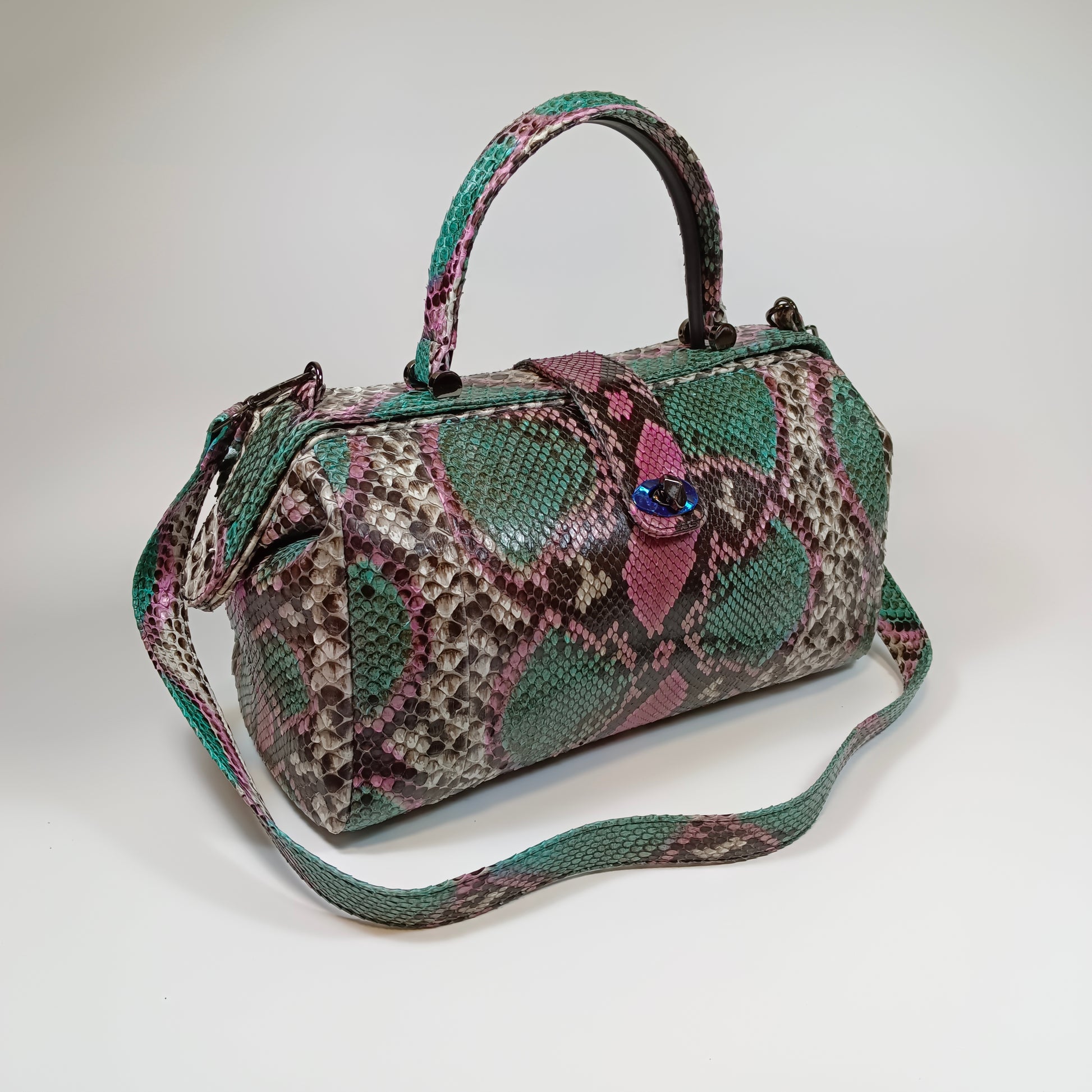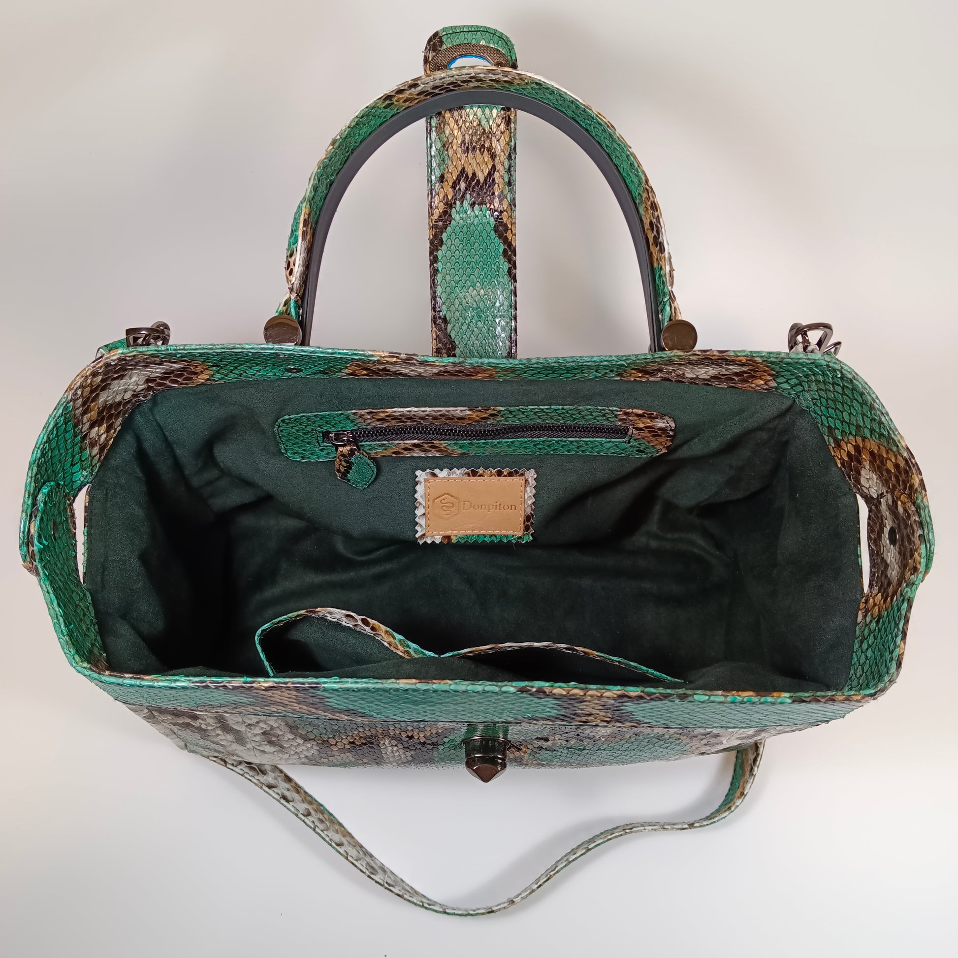 A bolsa Maya é confeccionada com pele genuína de Python do Sudeste Asiático, criando uma peça exclusiva e de alta qualidade. Seus detalhes refinados e padrão único garantem que cada bolsa seja uma verdadeira obra de arte. Ideal para mulheres que valorizam um estilo sofisticado e distinto, a Maya é a combinação perfeita de modernidade e elegância. Com seu design atemporal, esta peça oferece luxo e funcionalidade, sendo perfeita para qualquer ocasião. Dimensões: 33 cm de comprimento, 16 cm de largura e 22 cm de altura | alça de couro 110 cm.