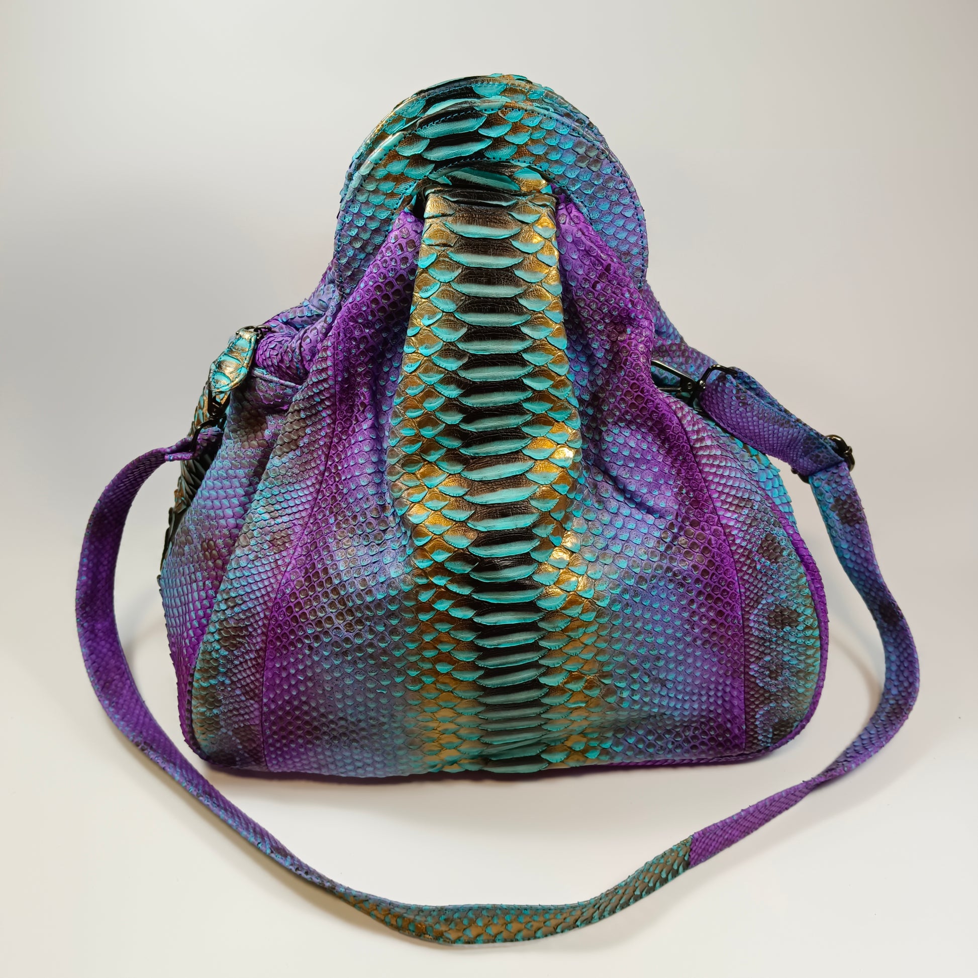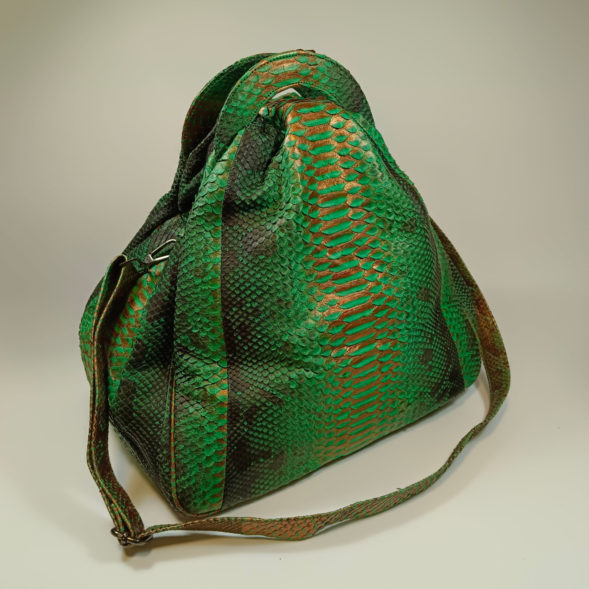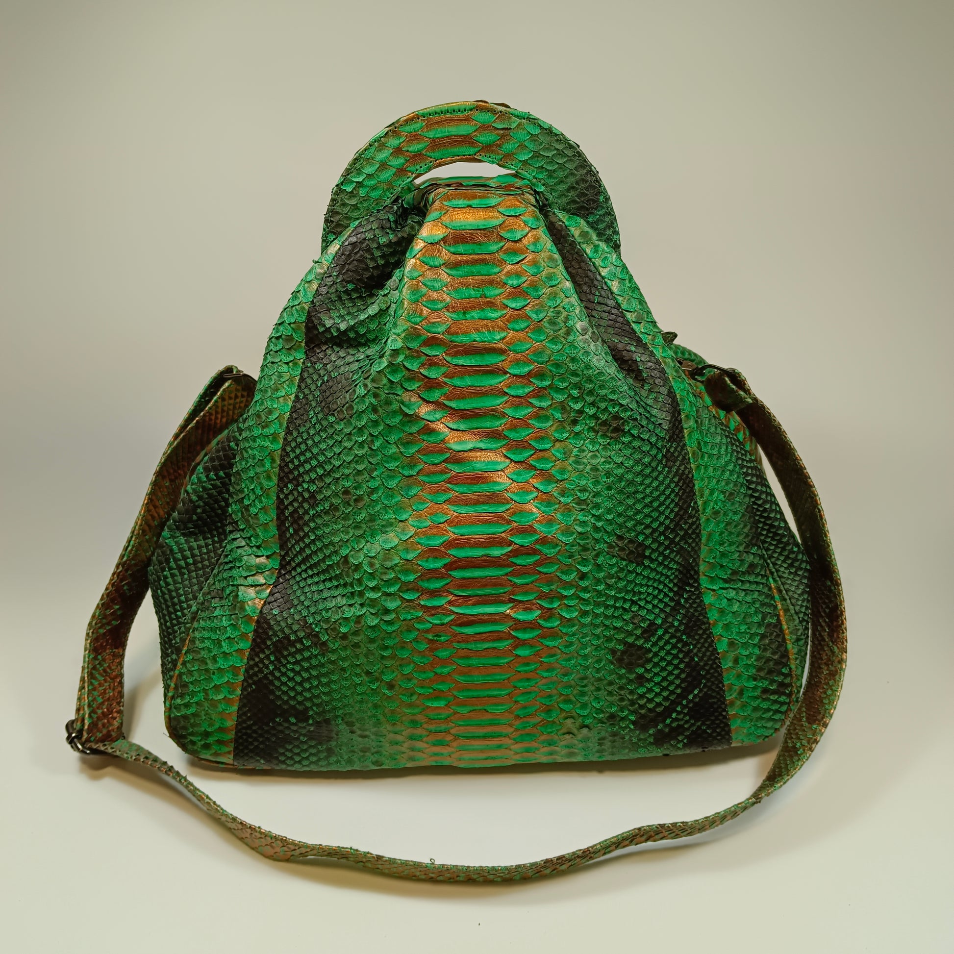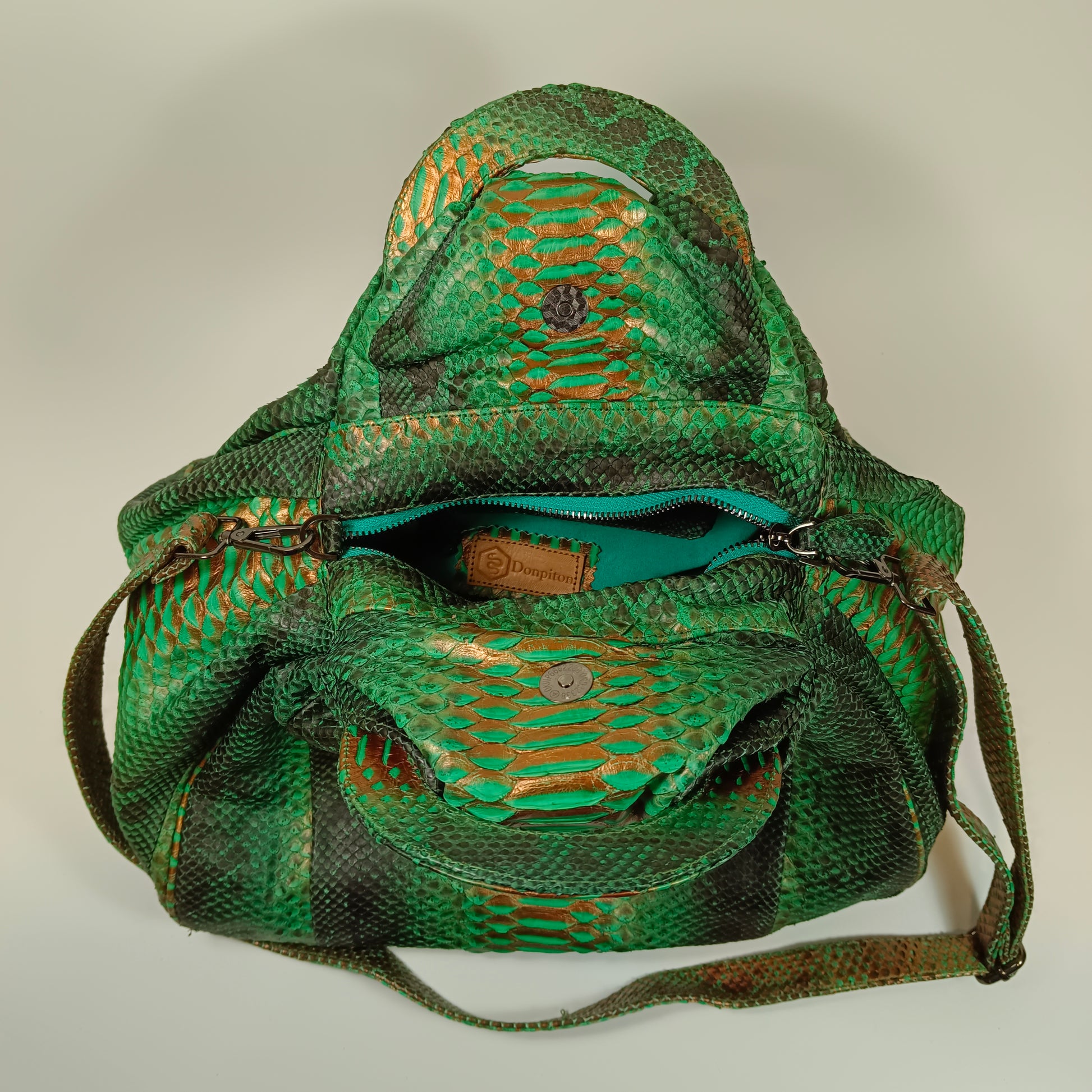 A bolsa Panda é confeccionada à mão com pele autêntica de Python do Sudeste Asiático, trazendo um toque de exclusividade e sofisticação incomparável. Com padrões únicos em cada peça, a Panda oferece um design elegante e atemporal, perfeito para mulheres que buscam destacar-se com estilo e requinte. Sua estrutura refinada e acabamento impecável refletem luxo discreto e funcionalidade, tornando-a uma escolha versátil para qualquer ocasião. Dimensões: 34 cm de comprimento, 26 cm de largura e 33 cm de altura | alça de couro 115 cm.