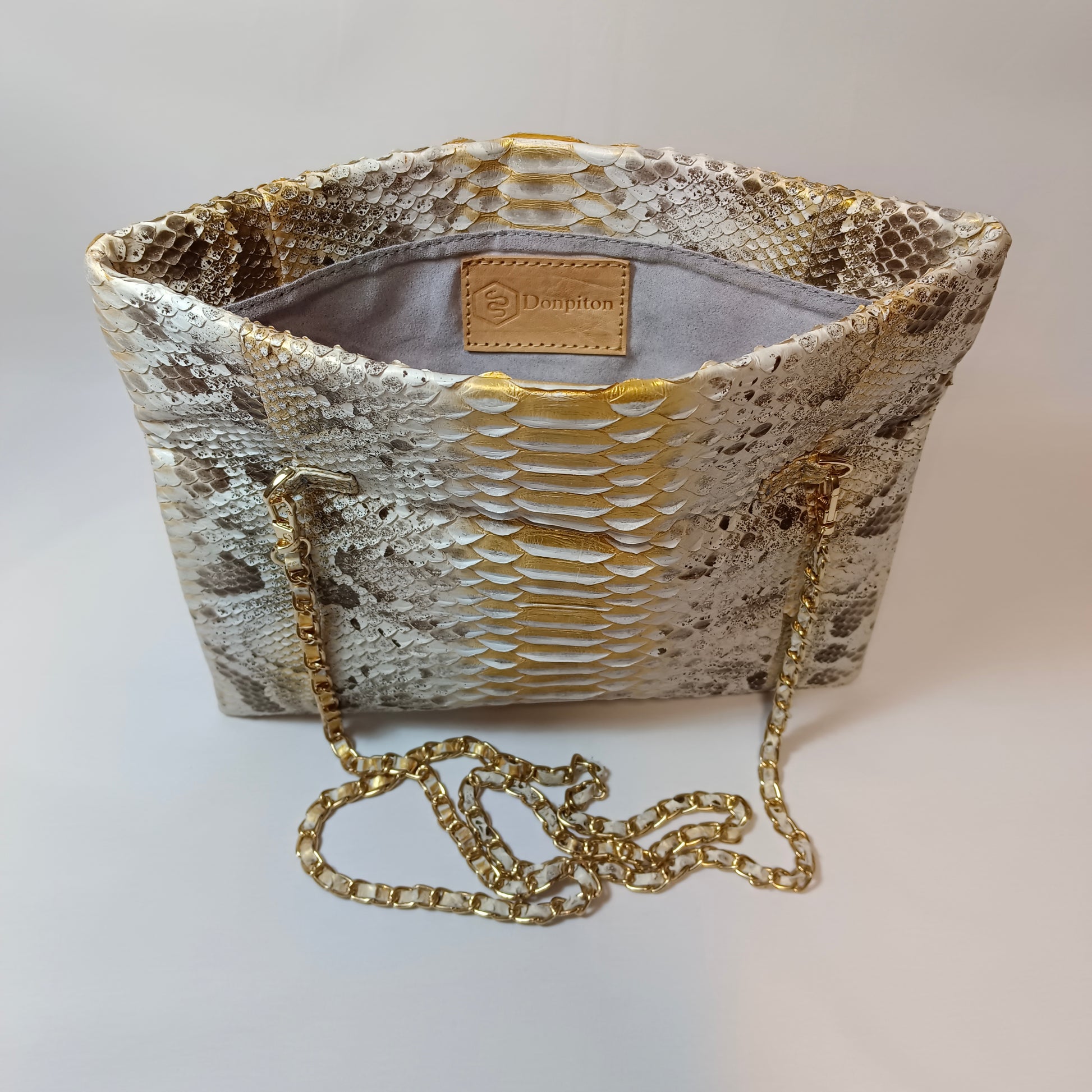 A bolsa Patrícia é confeccionada artesanalmente com pele legítima de Python do Sudeste Asiático, garantindo exclusividade e elegância em cada peça. Com padrões naturais únicos, a Patrícia oferece um design clássico e sofisticado, perfeito para mulheres que buscam um toque de luxo atemporal. Versátil e refinada, esta bolsa é o acessório ideal para destacar qualquer look com estilo e prestígio. Dimensões: 27 cm de comprimento e 16 cm de altura | alça de corrente de metal 120 cm.