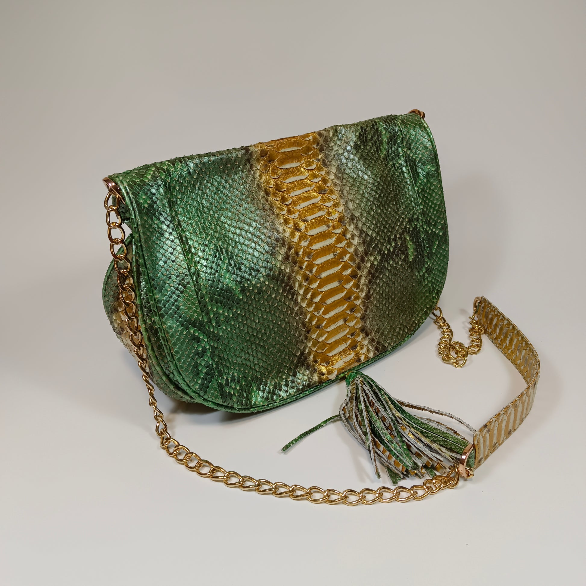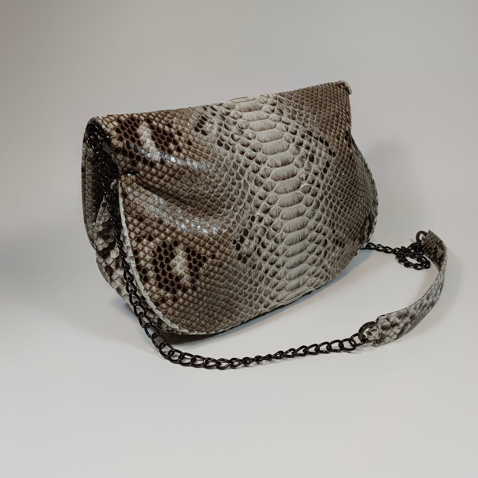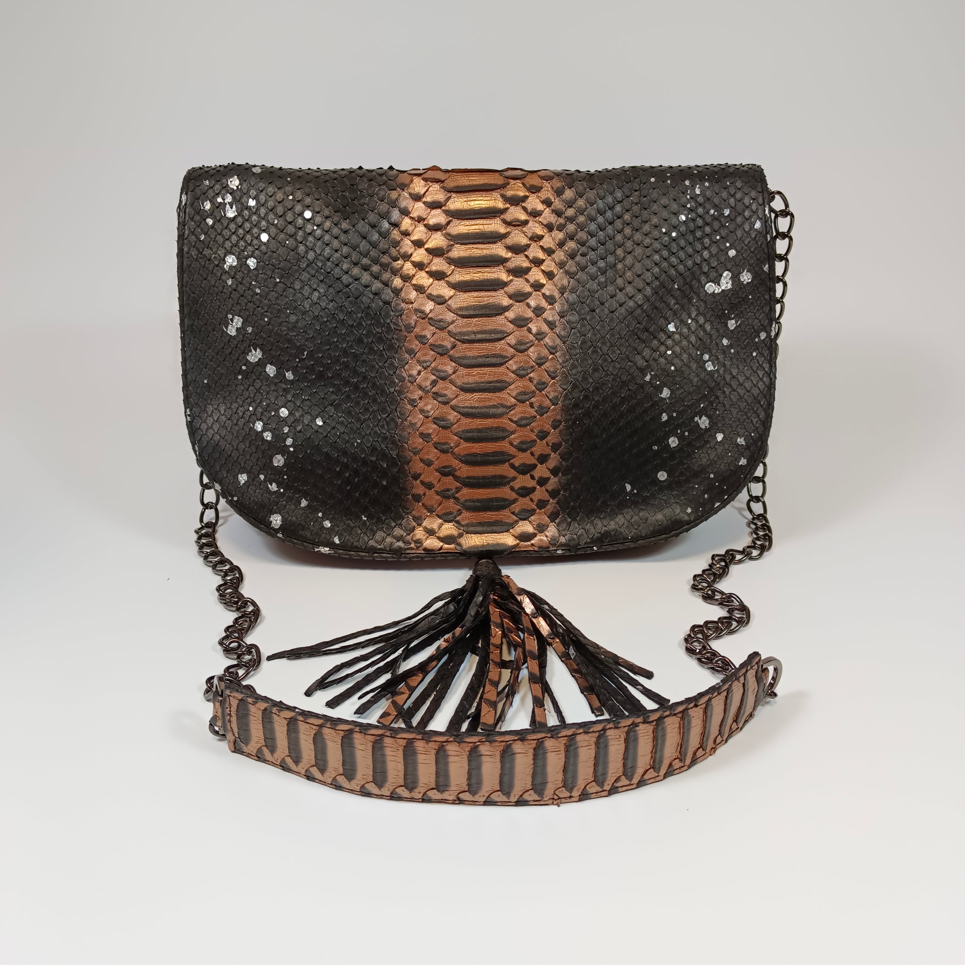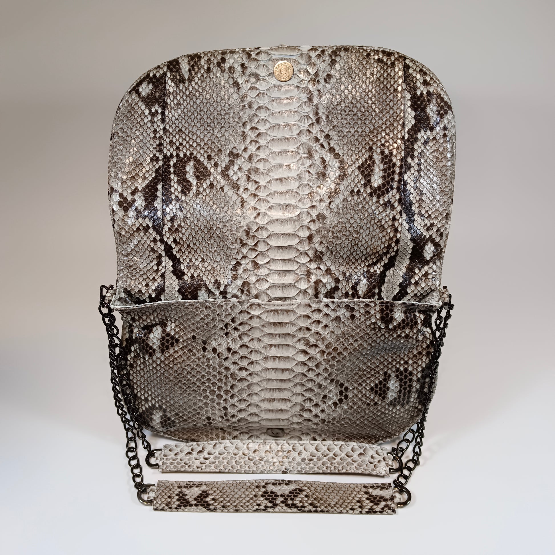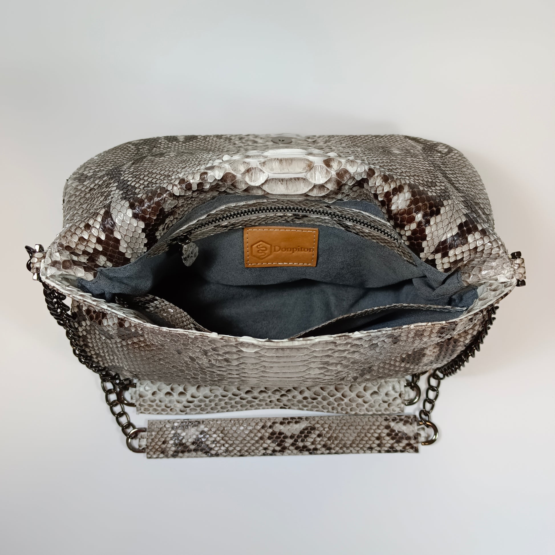 A bolsa Samba é uma peça artesanal feita com pele de cobra Python genuína do Sudeste Asiático, oferecendo uma exclusividade natural em cada detalhe. Cada pele de Python possui padrões e nuances próprias, o que torna cada bolsa única. Seu design alia sofisticação e simplicidade, criando um acessório que combina elegância e autenticidade. A Samba é ideal para quem busca um toque de luxo com estilo refinado e exclusivo. Dimensões: 30 cm de comprimento, 11 cm de largura e 20 cm de altura | alça em couro e corrente de metal 70/105 cm.