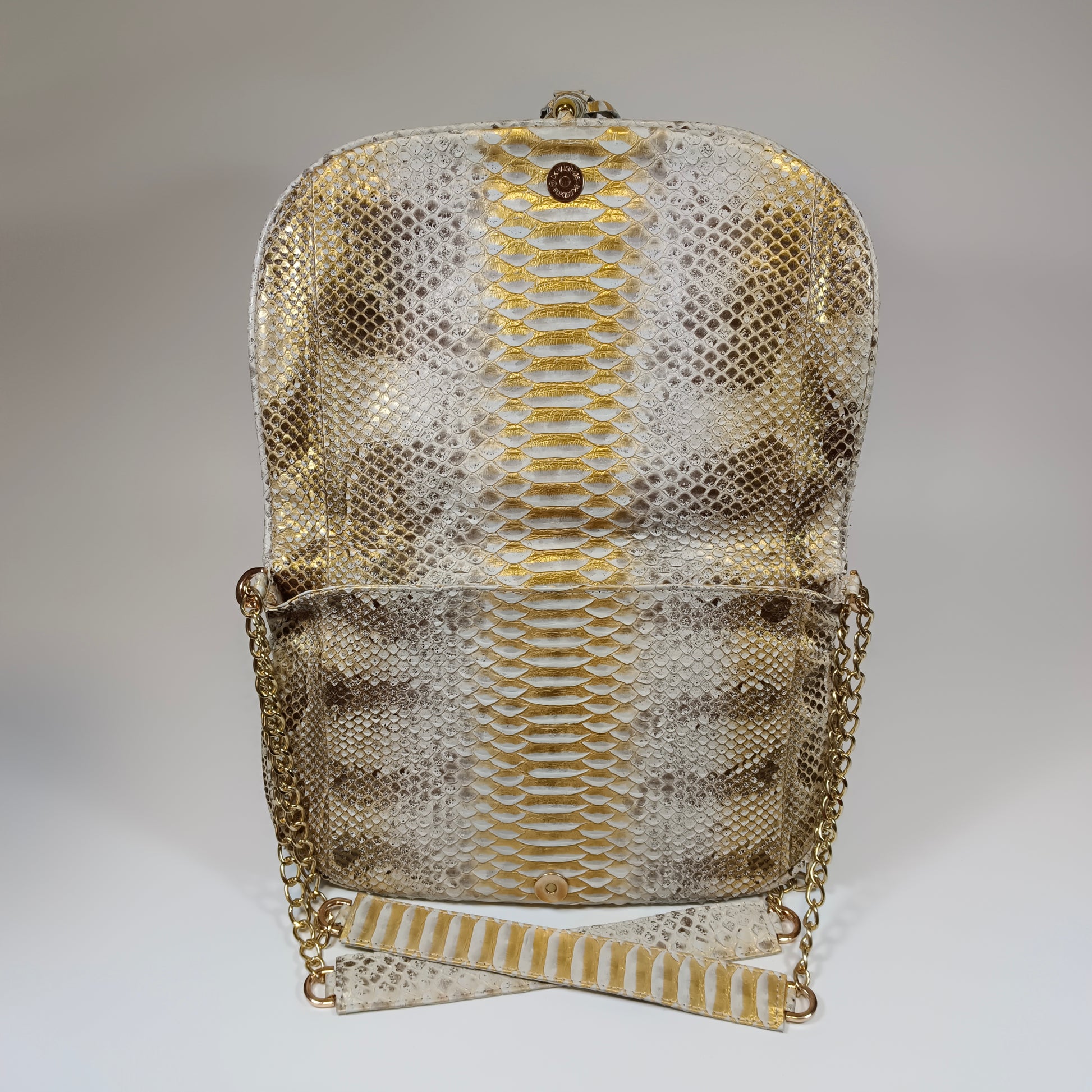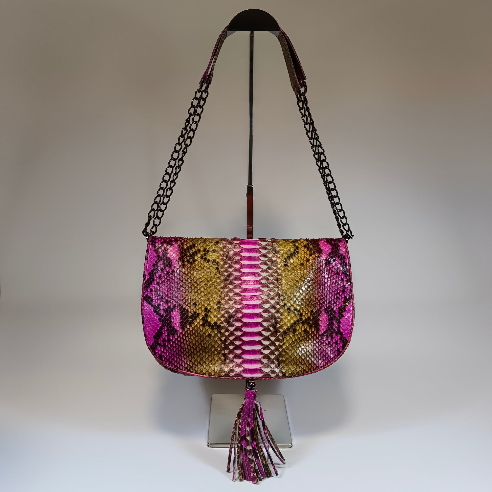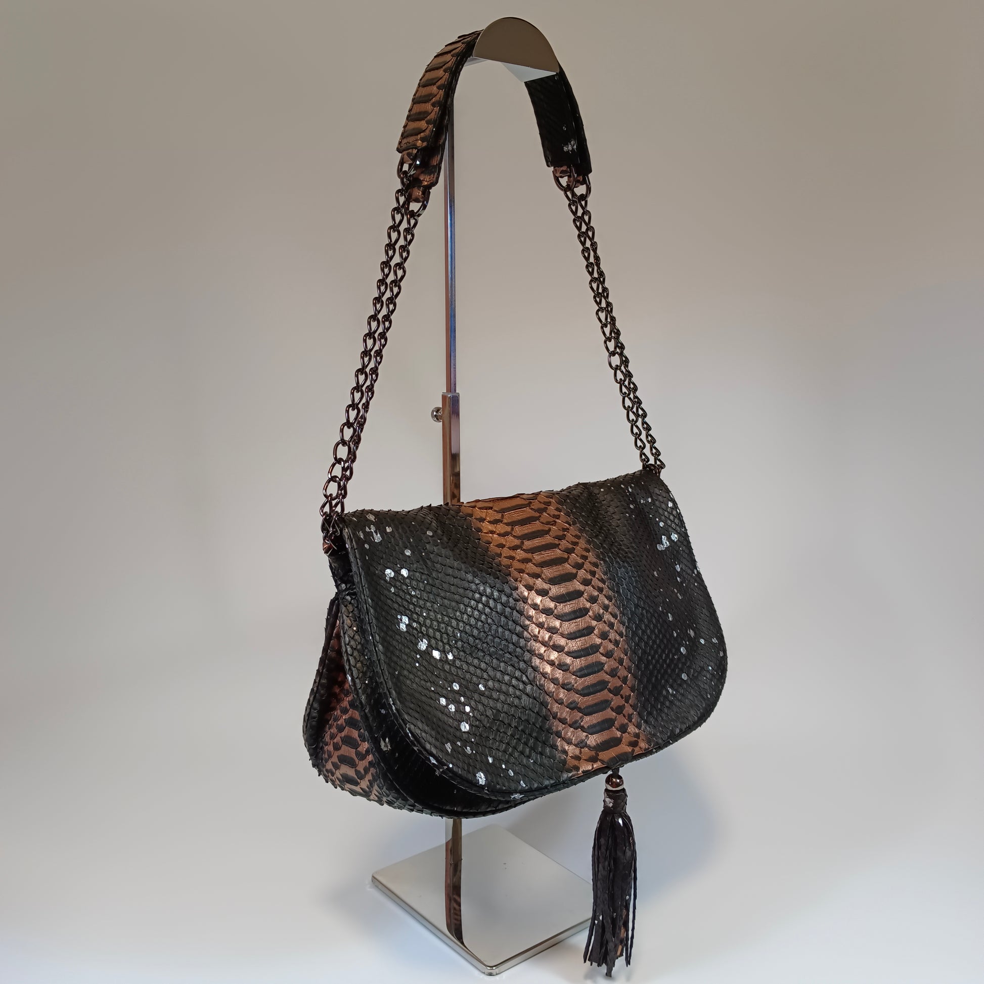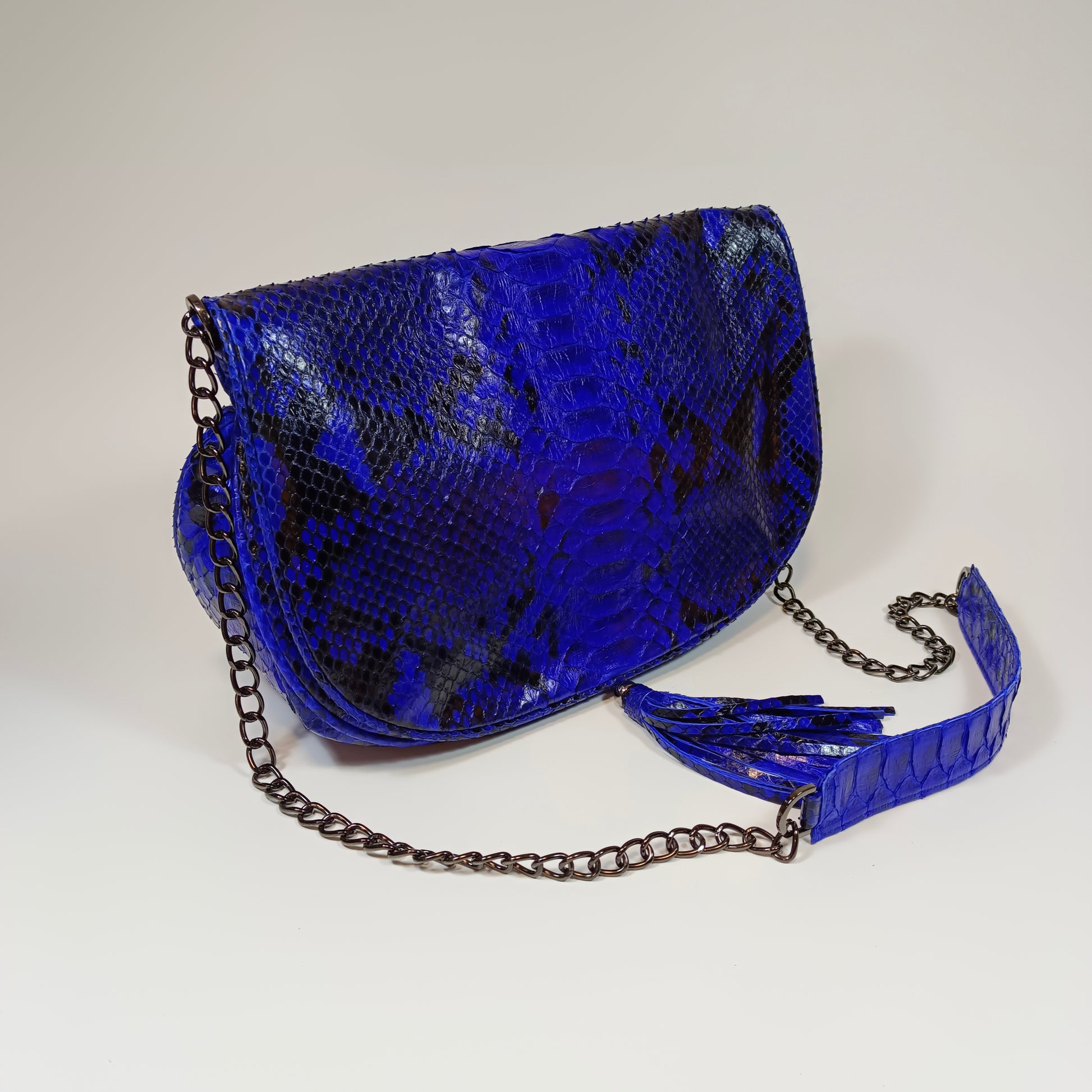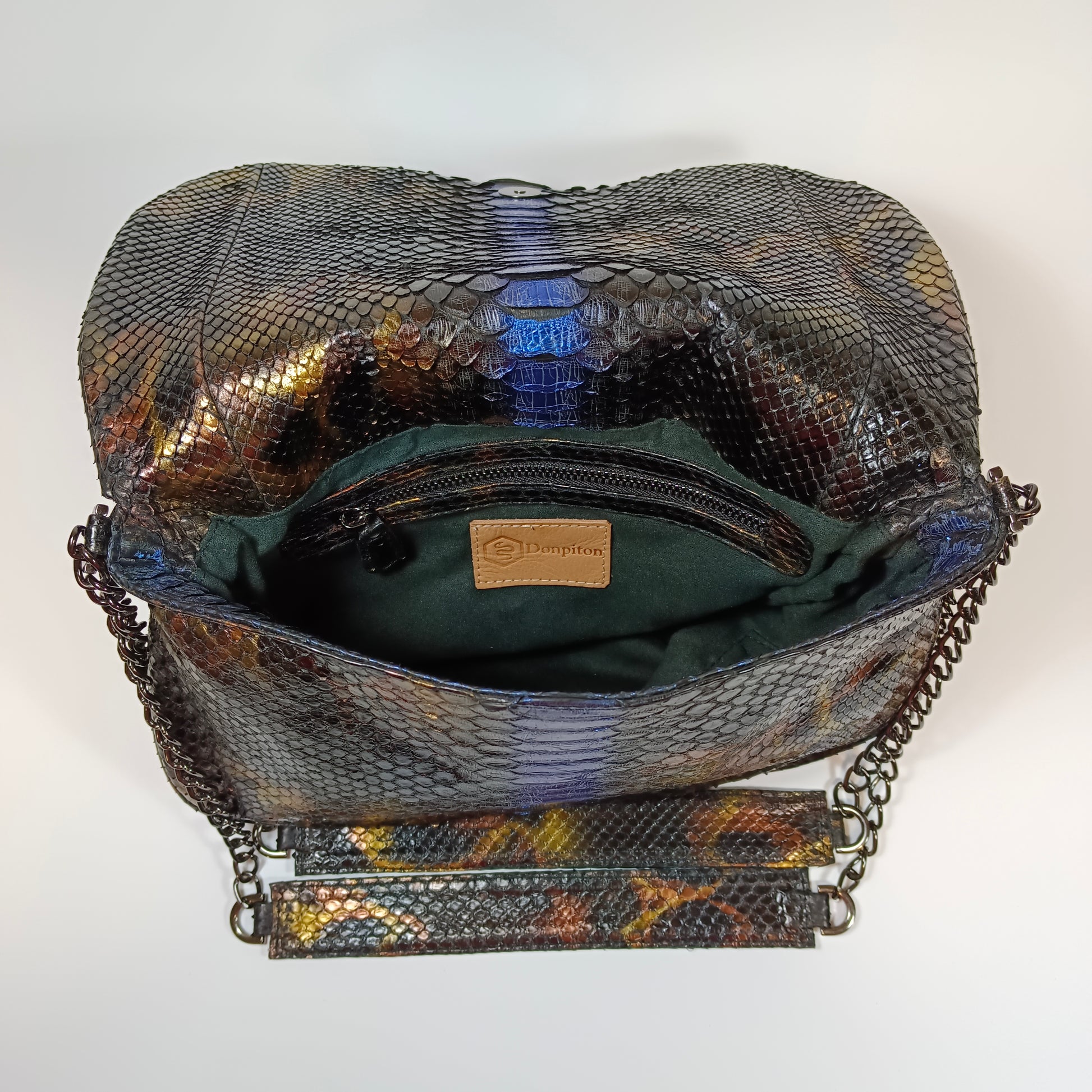 A bolsa Samba é uma peça artesanal feita com pele de cobra Python genuína do Sudeste Asiático, oferecendo uma exclusividade natural em cada detalhe. Cada pele de Python possui padrões e nuances próprias, o que torna cada bolsa única. Seu design alia sofisticação e simplicidade, criando um acessório que combina elegância e autenticidade. A Samba é ideal para quem busca um toque de luxo com estilo refinado e exclusivo. Dimensões: 30 cm de comprimento, 11 cm de largura e 20 cm de altura | alça em couro e corrente de metal 70/105 cm.