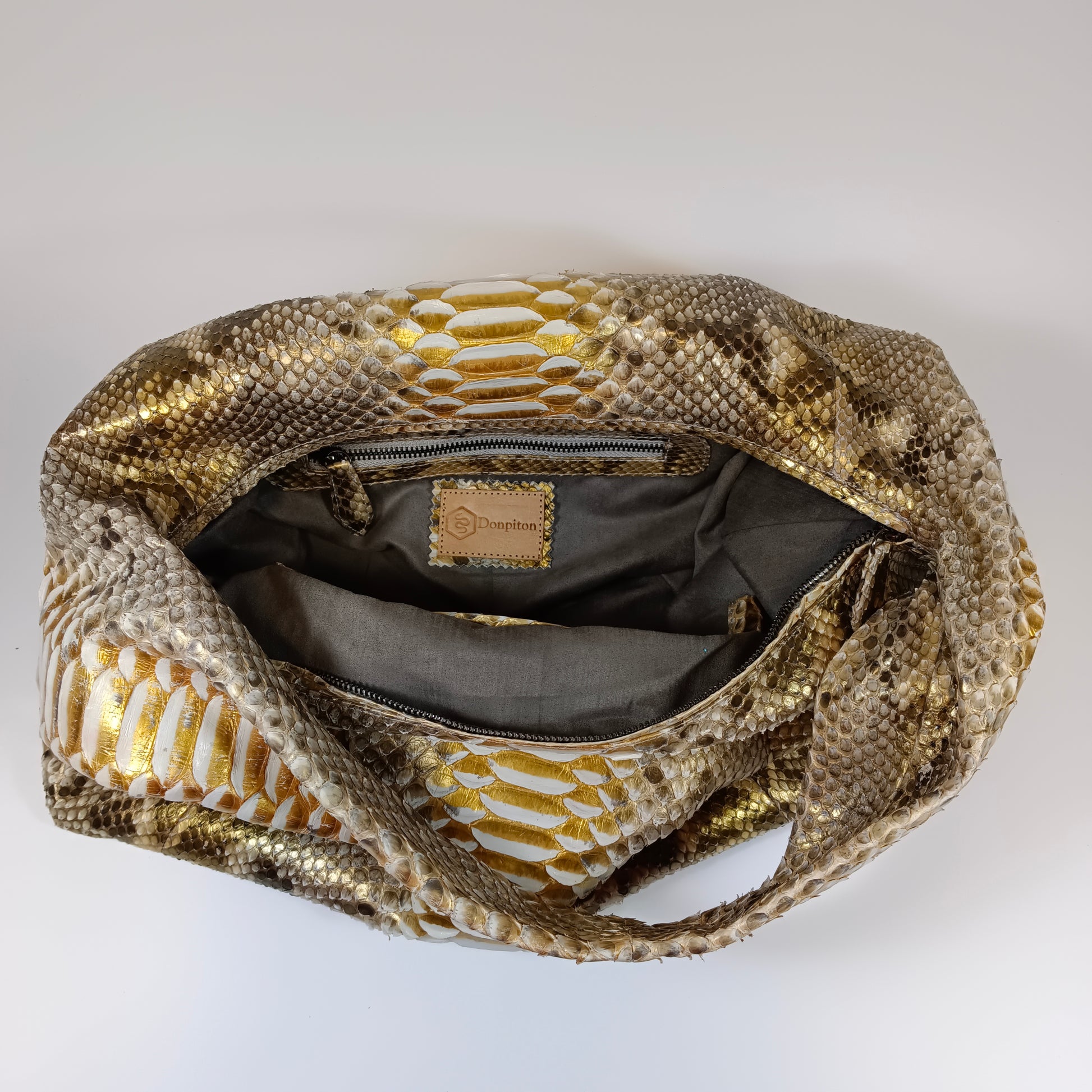 A bolsa Susana é confeccionada artesanalmente com pele de cobra Python genuína do Sudeste Asiático, oferecendo exclusividade e autenticidade em cada peça. Assim como a biometria humana, cada pele de Python possui padrões e tonalidades únicos, garantindo um design minimalista e atemporal. Combinando luxo e glamour, a bolsa Susana reflete prestígio e um toque de glamour, ideal para quem valoriza estilo e elegância inconfundíveis. Dimensões: 44 cm de comprimento, 16 cm de largura e 30 cm de altura.