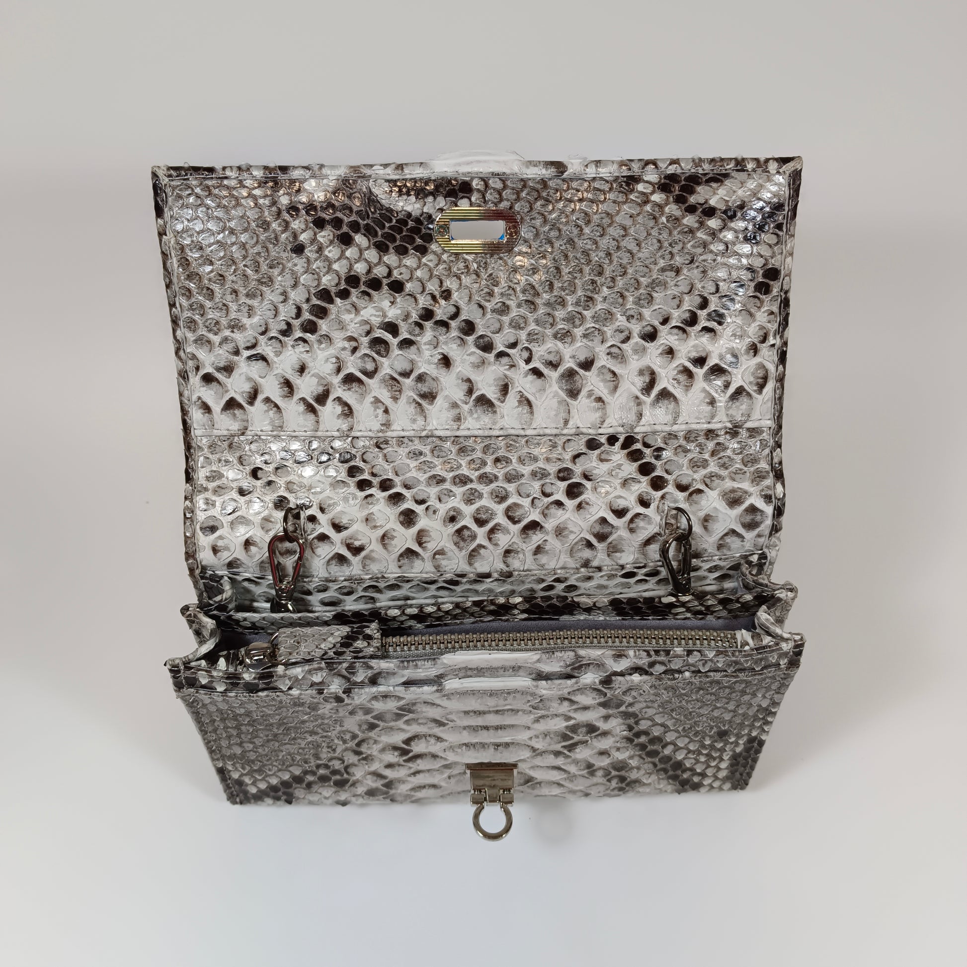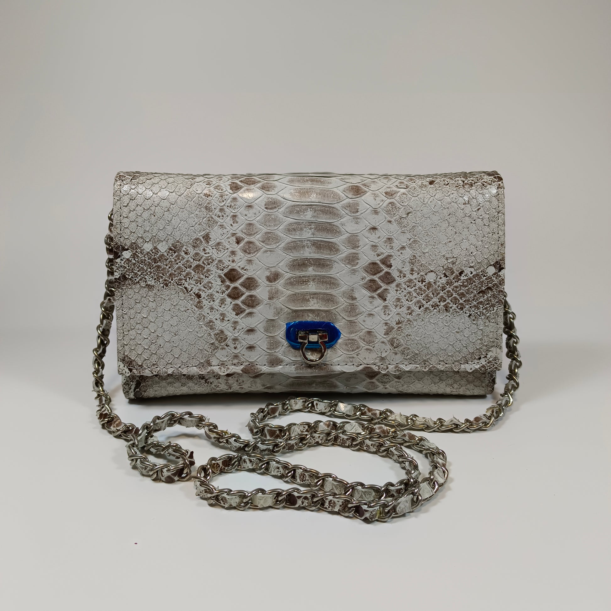 A bolsa Talita é meticulosamente feita à mão com pele de cobra Python genuína, proveniente do Sudeste Asiático, destacando-se pela sua autenticidade e exclusividade. Cada pele de Python é única, com padrões e nuances distintos, tornando a Talita uma peça exclusiva e irrepetível. Seu design contemporâneo e refinado transmite uma elegância discreta, enquanto as texturas naturais conferem um toque exótico e sofisticado. A Talita é perfeita para quem busca uma combinação de estilo e distinção em um acessório luxuoso. Dimensões: 21,5 cm de comprimento, 6 cm de largura e 12 cm de altura | alça de corrente de metal 120 cm.