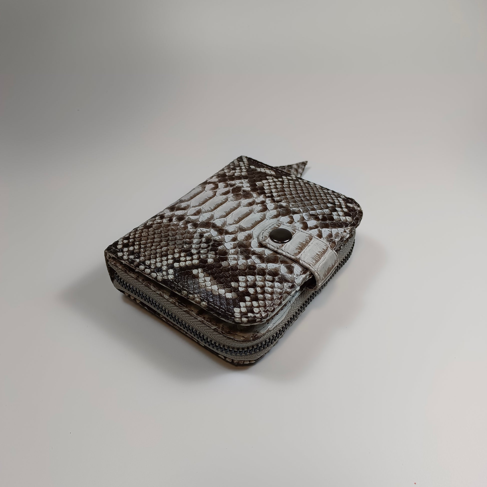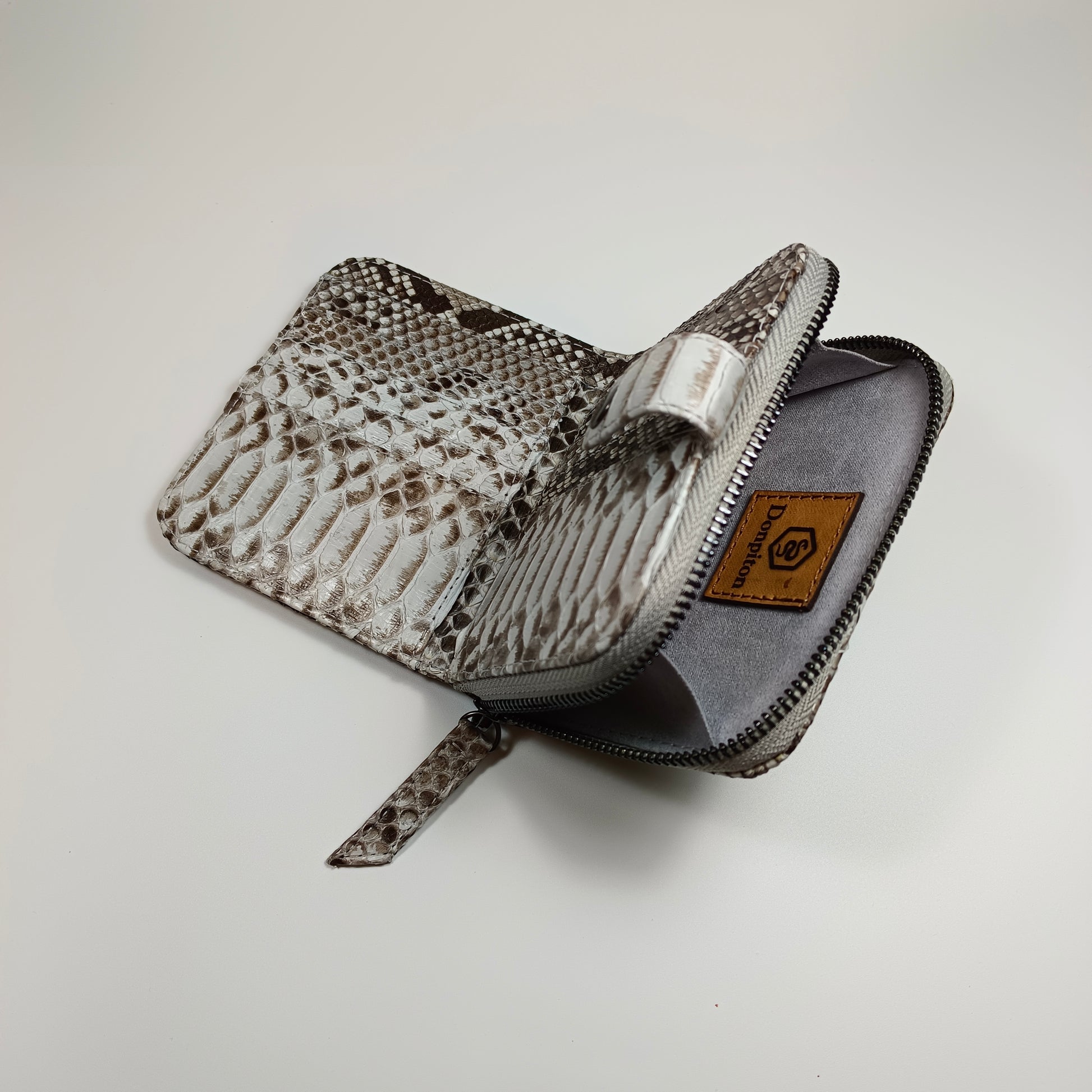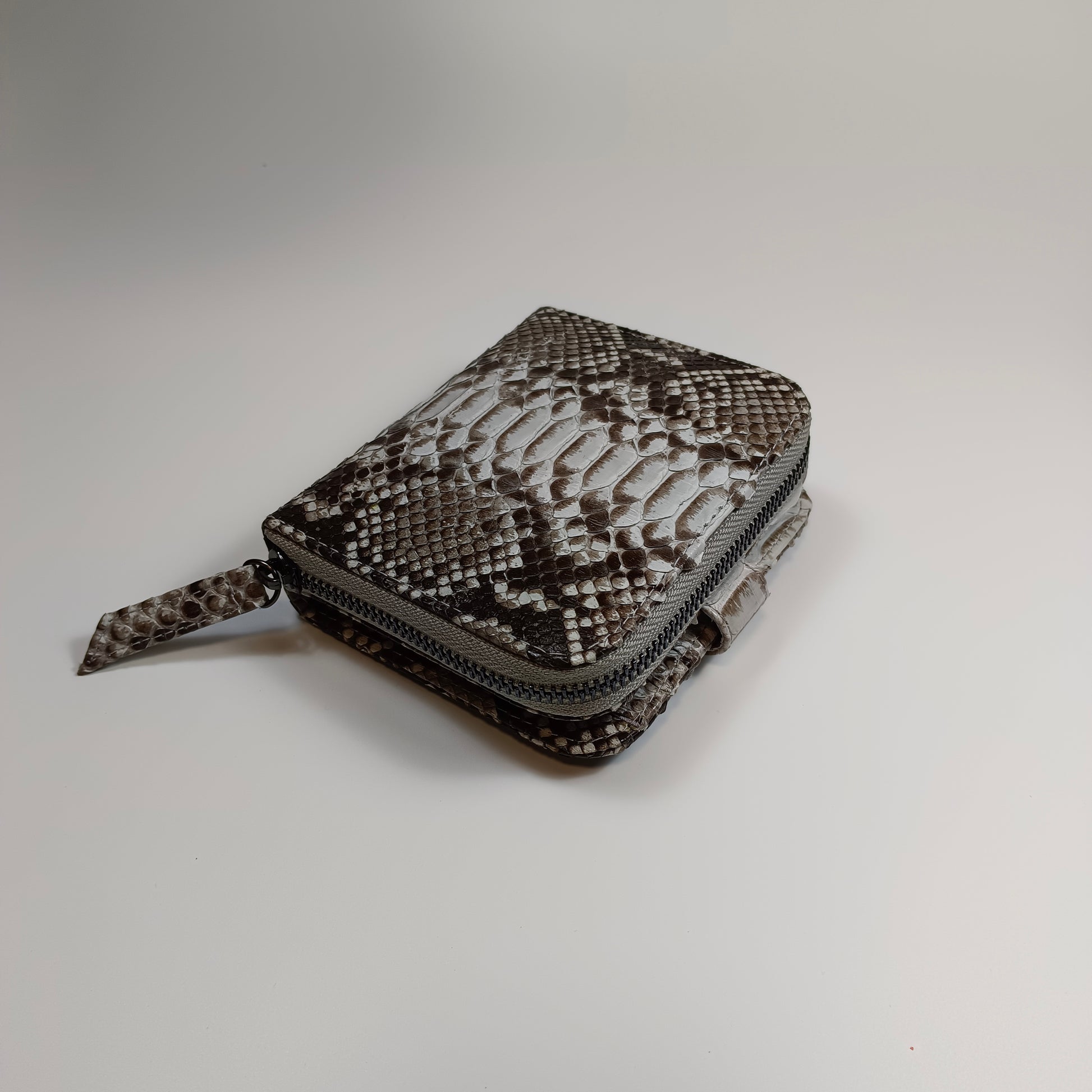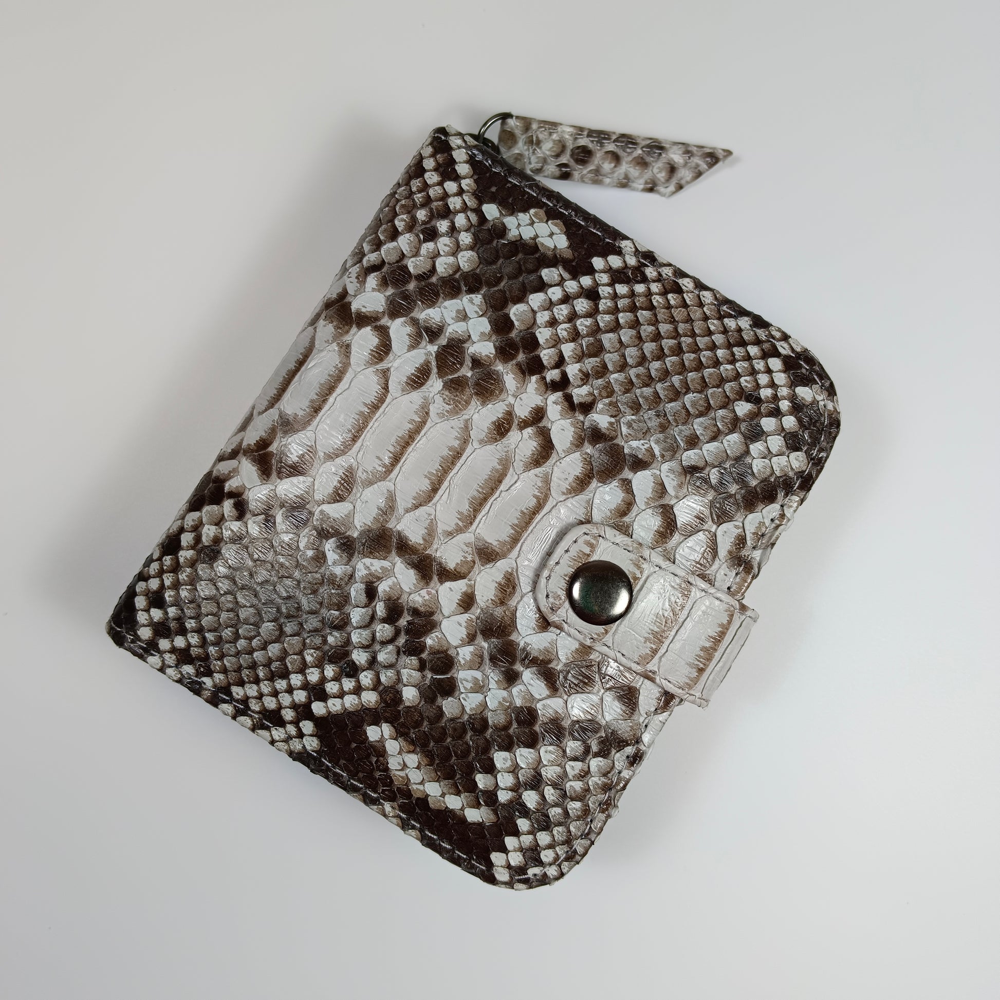 A carteira Jacey, confeccionada à mão com pele de cobra Python genuína do Sudeste Asiático, oferece exclusividade e elegância com seus padrões e tonalidades únicos. Compacta e sofisticada, seu design artesanal combina luxo e praticidade, perfeita para quem busca um acessório refinado e autêntico. Dimensões: 12 cm de comprimento, 10 cm de altura.